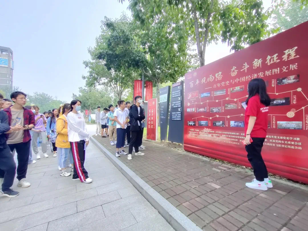 同日,学院党史学习教育宣讲团成员带领新生们参观学习《百年风雨路,奋斗新征程》、《百年党史与中国经济发展图文展》。此展是经济学院研究生党支部学史学习教育的阶段性成果汇报,同学们通过通读党史,在老师的指导下,梳理百年来中国经济发展的重大事件和标志性成果,以及党的有关重要会议、决策。2021级新生们在研究生宣讲团成员的细致讲解下,纷纷表示要从党史中汲取智慧和滋养,奋发图强,学好专业知识,讲好党的故事,弘扬党的优良传统。
