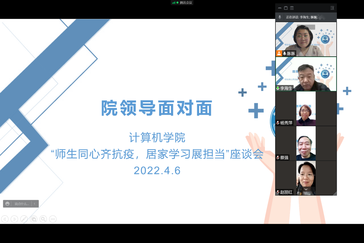 为了进一步解读防疫相关政策,掌握学生居家学习期间的各方面情况,4月6日,计算机学院召开了院领导面对面——“师生同心齐抗疫,居家学习展担当”座谈会。学院党委书记蔡强、院长李海生、副院长谭励、副院长刘瑞军、教师代表及本科、研究生各年级学生代表参加本次座谈会,会议由学院党委副书记杨秀萍主持。