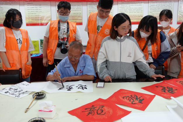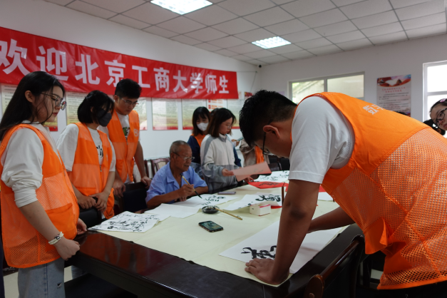 实践期间,同学们走进村委会,与原村支部书记张宝珠老爷爷进行书法交流。正襟威坐,一个笔酣墨饱的“福“字完成了,虽然张爷爷已是耄耋之年,但他的笔法依旧苍劲有力,他的思想与精神依旧跃然纸上。精神所在,就是血脉所在、力量所在,就是信念所在、希望所在。在书法交流的过程中,张爷爷根据实践团成员几天以来的调研,在宣纸上写下”忠勇笃行 勤耕乐学“八个大字,字字铿锵,这是他对阜高营村风民风的总结,更是对青年一代的期许,是青春的承接,亦是使命的传递。同学们牢记教诲,几天里用脚步丈量土地,用心去感悟红色精神,用笔书写新时代新农村的点点滴滴,用行动与这个时代同频共振。