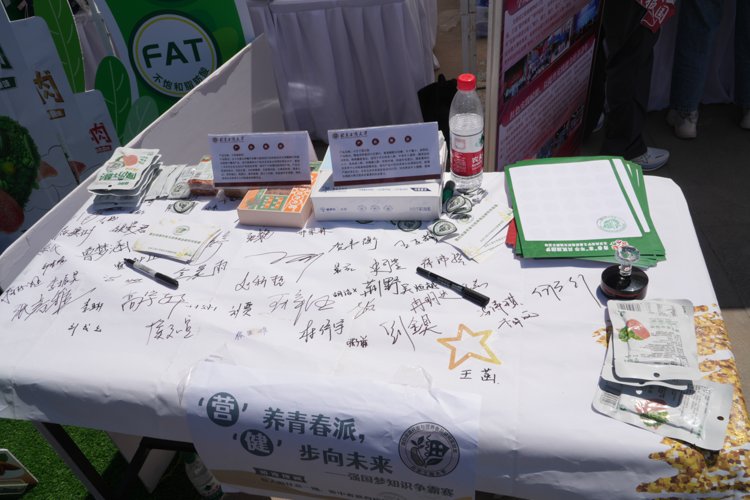 活动现场,实验室团队精心设计了主题互动区,包括“营养有一套”主题互动区和将健康常识转化为趣味科普的答题区。参与者通过套圈游戏赢取实验室自主研发的植物肉、大豆肽粉等健康产品,并参与营养知识问答,在互动中了解蛋白营养与健康益处。活动现场还展出了团队在服务国家战略、科技创新、人才培养及团队建设方面取得的成果,诠释了“铸魂之家、创新之家、育才之家、幸福之家”的团队理念,吸引众多师生驻足交流。