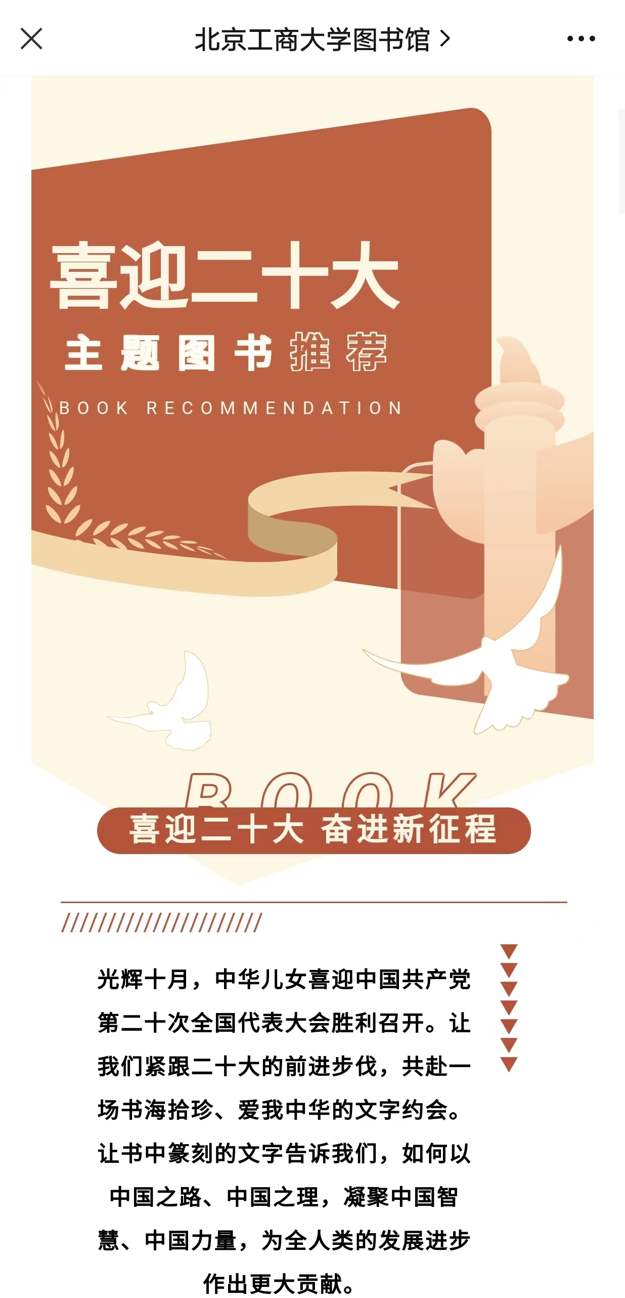 开展“书海拾珍 爱我中华”喜迎二十大主题图书推荐活动。图书馆精选出《共产党员的力量》《习近平与大学生朋友们》《中国金融的力量》《云上的中国2》《大江大河》《中国通史》等6部书籍推荐给读者们阅读,在党的二十大胜利召开之际,通过阅读以上书籍,不断强化伟大思想学习是新时代党员干部的精神动力,深刻感受习近平总书记对教育的重要论述,以及了解新时代中国金融、科技、产业等领域的伟大变革,从而引发对美好未来的思考与探索。