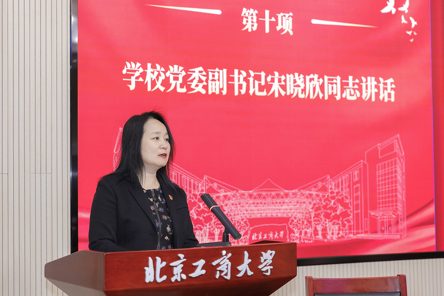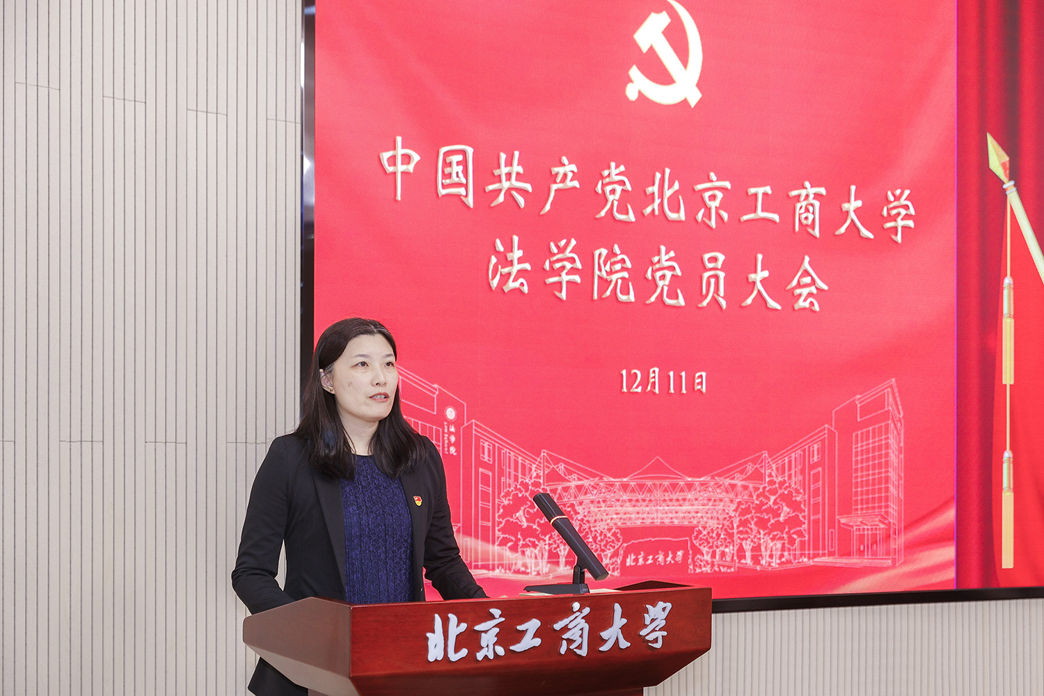 宋晓欣代表学校党委对大会的召开表示热烈的祝贺!她在讲话中指出,法学院有着深厚的办学底蕴和鲜明的办学特色。五年来,学院党委发挥党建引领作用,在教育教学、人才培养、学科专业建设、科学研究、社会服务等方面取得了可喜成绩,为学校发展作出了积极贡献。她鼓励师生党员奋楫以航,主动融入学校“工商一体化”发展,主动对接国家与首都所需,全面推动学院事业高质量发展。她对学院党委提出四点希望:一是充分发挥党建引领作用,为学院事业高质量发展提供坚强政治保证和组织保障。二是落实立德树人根本任务,培养符合新时代首都发展的卓越法律人才。三是坚持特色差异化发展,以更大作为融入和服务新时代首都发展。四是持之以恒推进全面从严治党,营造良好的政治生态、学术生态、育人生态。