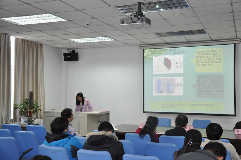 14级辅导员对新生入校100天来的学业情况、学风情况、期中考试情况进行了总结分析,11、12、13各年级辅导员对所带年级2013-2014学年的学业情况、学风状况进行了总结。辅导员通过详实的数据、直观的图表,从学分平均绩点、各绩点段人数及比例、四六级通过率、挂科率、就业率、出国率、升学率、学困生帮扶措施等多方面对学业状况进行了细致分析。其中,14级重点对期中考试成绩及重点关注学生、考风考纪、学生舆情等进行了分析,13级重点分析了挂科情况、困难科目和重点学困生以及帮扶措施,12级重点分析了四六级成绩、科技竞赛情况、考研出国学生意愿摸排,11级则重点分析了清考门数、就业困难生和学生毕业去向(出国、就业及升学)。