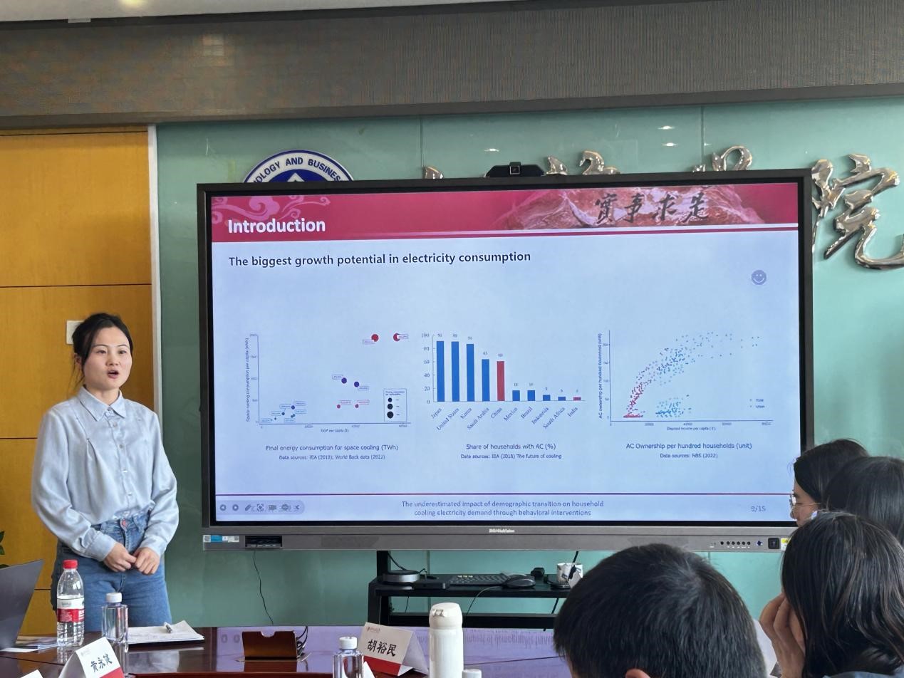 中国人民大学王漫玉博士报告了工作论文“The underestimated impact of demographic transition on household cooling electricity demand through behavioral interventions”,文章利用居民部门能源消费随机控制实验,探究行为干预对居民制冷电力需求的影响,研究发现具体行为干预会促使居民制冷电力消耗平均下降13.7%;考虑到人口结构的转变,有针对性的行为干预措施使得总需求平均减少34.7%。