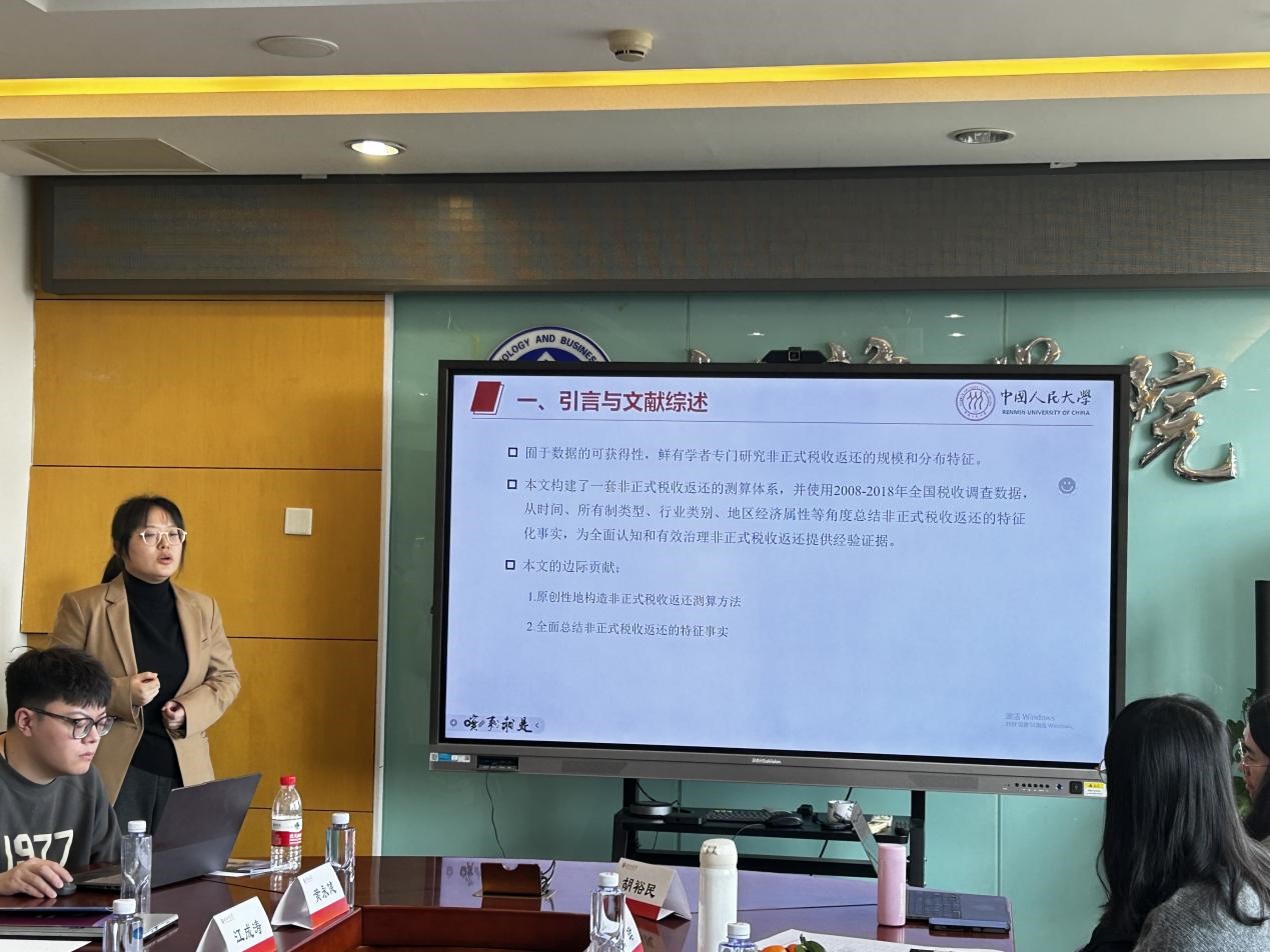 中国人民大学曾傅雯博士报告了工作论文《中国非正式税收返还:测算与分析》,文章构建了一套非正式税收返还的测算体系,并使用2008-2018年全国税收调查数据,从时间、所有制类型、行业类别、地区经济属性等角度总结非正式税收返还的特征化事实,研究发现全国层面的非正式税收返还规模呈阶段性变动,但占全国一般公共预算收入和全国税收收入的比重总体呈下降趋势;非正式税收返还水平与地区经济发展水平、营商环境、经济发展目标、财政收入结构密切相关。