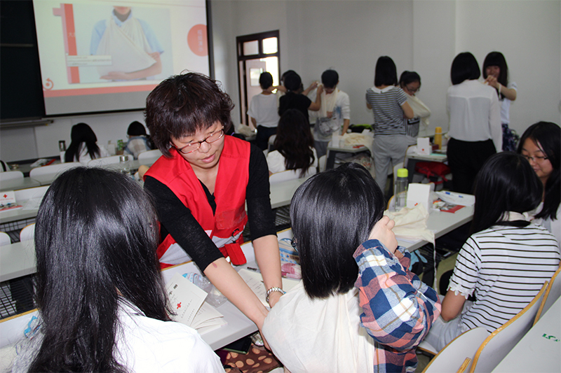 与以往不同,本次急救培训采用小班式教学,学员的人数限制在40人以内,并且首次尝试16学时,即两天的急救培训。学习内容包括简单包扎、心肺复苏、AED的使用等,内容更加丰富,形式更为多样。小班式教学使得同学们有更多的机会与讲师交流,学员们人手一个教具,大大增加了学习效率,有利于同学们更快更好地掌握急救技能。