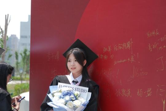 商学院在二期新学活广场上设置了签名留言展板,毕业生们手握金色签字笔,纷纷在展板上留下自己的姓名和对彼此的祝福,手捧鲜花,留下最美的青春印记!