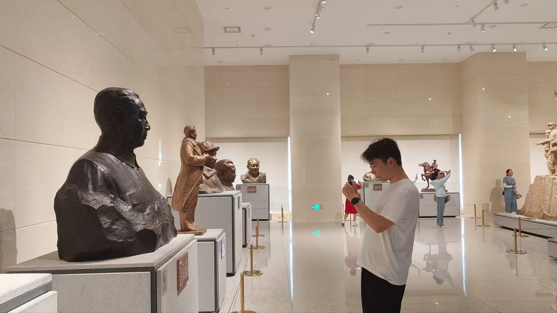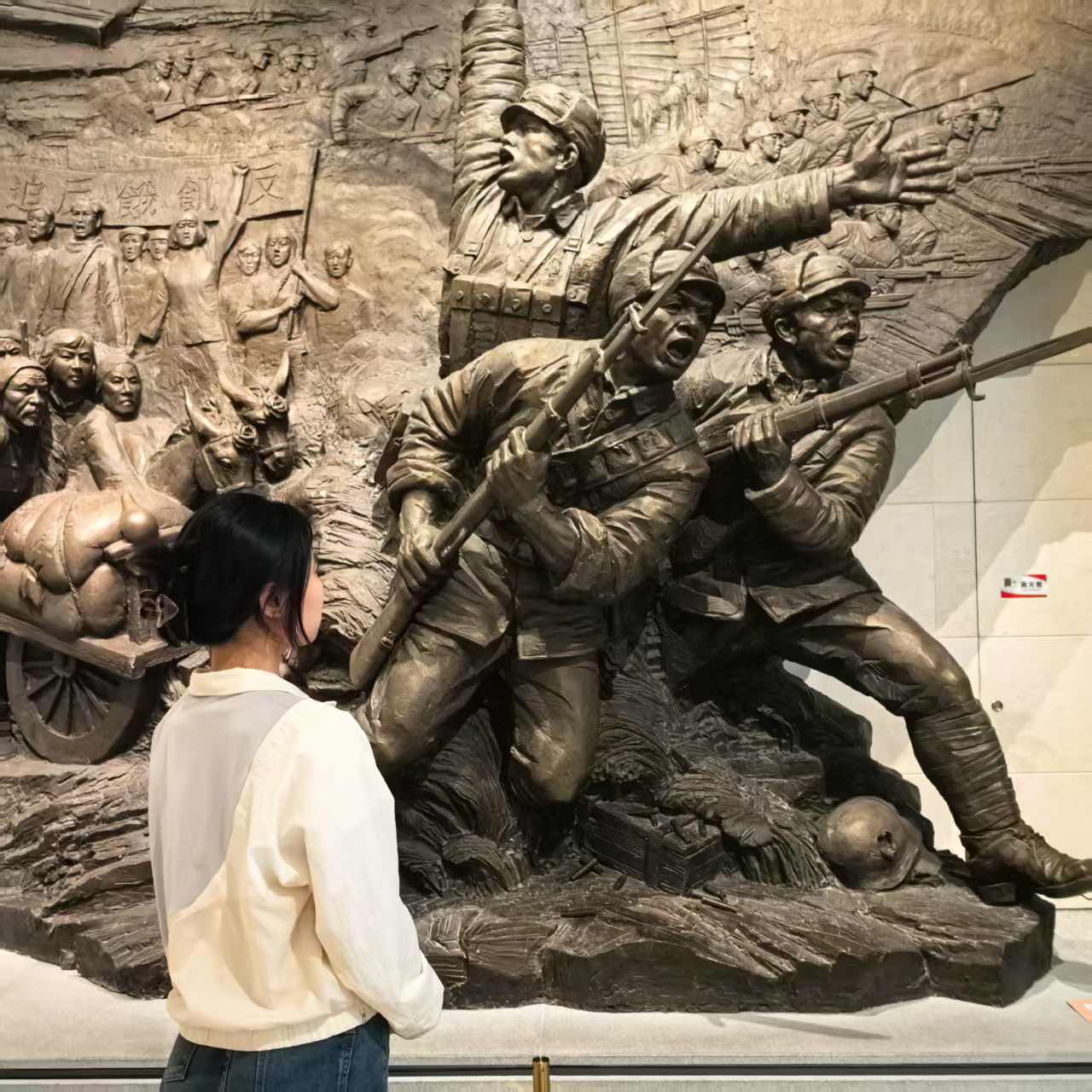 移步三楼革命艺术陈列厅,在这里,他们被一封封发黄的家书和一幅幅珍贵照片所触动,这些文献资料虽然年代久远,但其中的情感和故事依然鲜活。他们在雕塑厅中,通过抗战雕塑的生动形象,深刻感悟到全国各族人民在党的领导下抵御外侮、浴血奋战的民族气节;再现了共产党员“宁死不屈”的浩然正气,不少同学自发列队向雕塑行注目礼。
