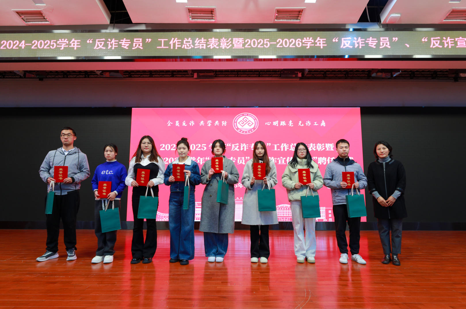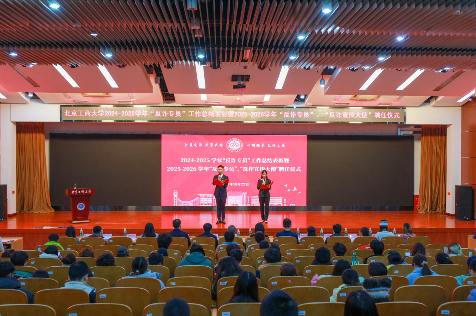 根据年度工作计划安排,2025年10月22日下午学校组织举办2024-2025学年“反诈专员”工作总结表彰暨2025-2026学年“反诈专员”“反诈宣传大使”聘任仪式。保卫处、研究生工作部、学生处等部门领导和房山公安分局沙晓娣警官以及各学院负责老师出席,全体反诈专员和反诈宣传大使参加活动。