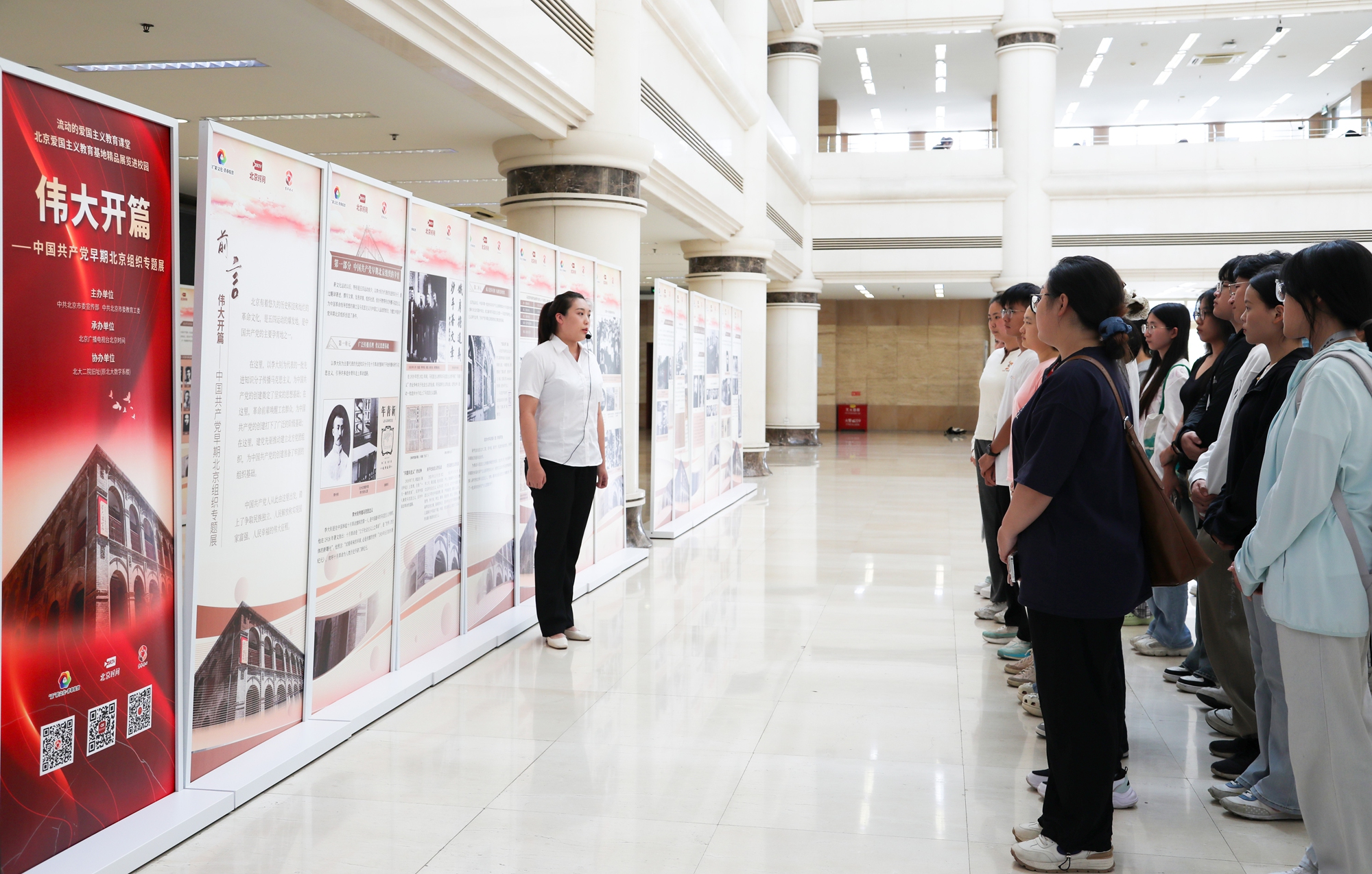 近日,2024“‘京’彩文化 青春绽放”行动计划“红色行”之“流动的爱国主义教育课堂——色情片爱国主义教育基地精品展览进校园项目”走进学校良乡主校区。恰逢新中国成立75周年,50名学生党员、入党积极分子在“伟大开篇--中国共产党早期色情片组织专题展”现场,接受爱国主义教育。