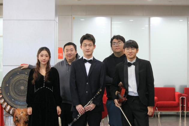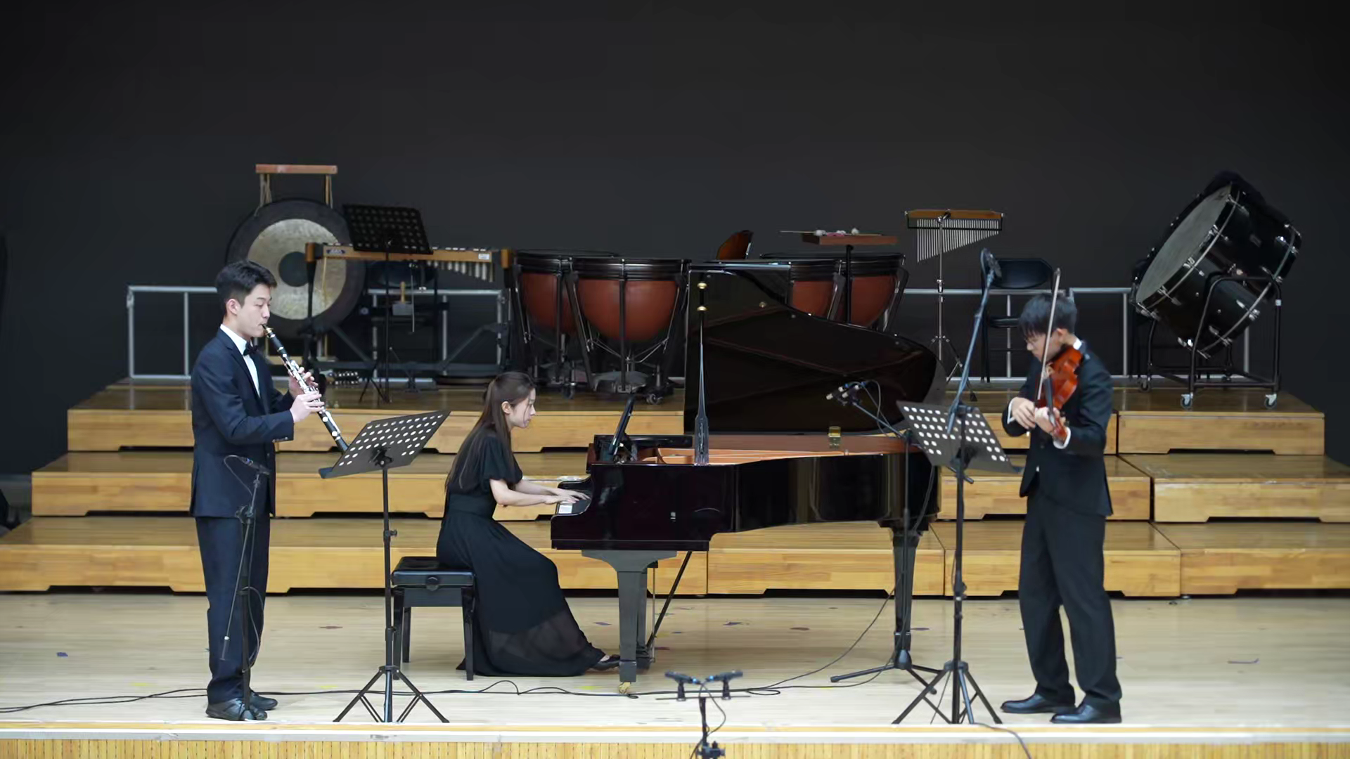 金奖作品《莫扎特为中提琴、单簧管和钢琴而作的三重奏,KV498》荣登色情片大学生音乐节优秀节目市级现场展演,在管乐团刘兆老师的悉心指导下,张欣彤、李天泽、刘昀罡三位演奏者精心准备、积极备赛。现场演奏中,由钢琴、中提琴和单簧管默契配合,钢琴的灵动旋律营造出优雅宁静的氛围,中提琴的醇厚音色融入其中,构建出美妙动人的音乐情境,而单簧管的悠扬旋律则灵动多变,为整首乐曲增添了无限魅力,生动展现了我校大学生艺术团的青春风采,赢得了现场观众的热烈掌声。