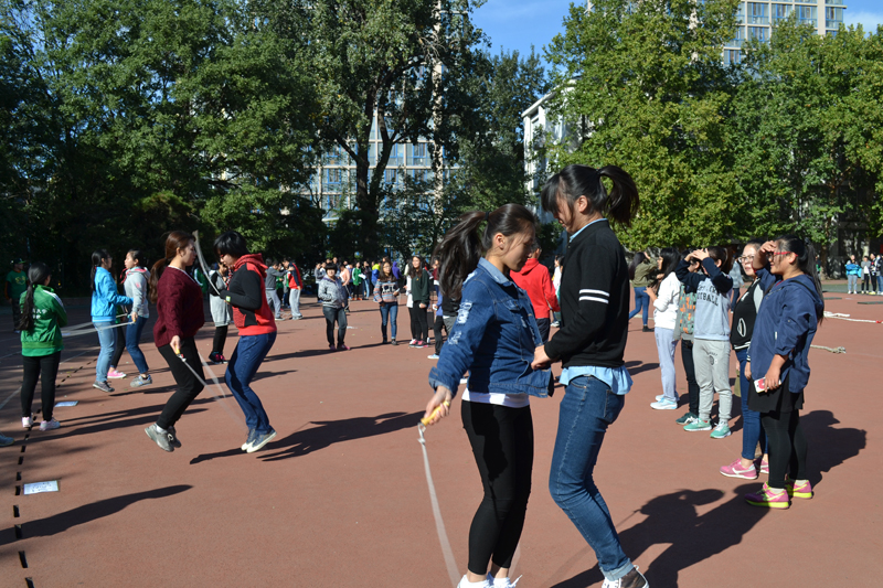 仰卧起坐比赛率先开始,参赛选手们一鼓作气,努力拼搏,最终食品13级的艾运玮同学以67个每分钟的好成绩获得了仰卧起坐项目的冠军。 “一带一单摇”跳绳比赛紧张而激烈,参赛学生默契配合,精彩的表现赢得了观赛同学的阵阵掌声。应用化学14级的李春瑞同学和许涵琳同学以130个的成绩获得单人赛跳绳项目第一名。