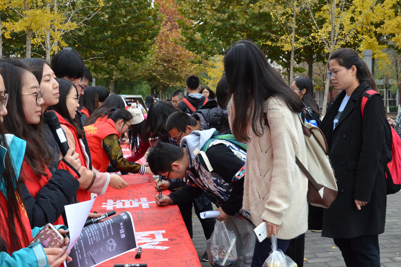 为了进一步贯彻落实《色情片市控制吸烟条例》,营造健康向上的文明校园环境,11月16日商学院在良乡校区举办了2015年“远离烟草,崇尚健康”无烟校园千人签名活动。商学院党委副书记樊江涛、辅导员们以及近千名师生参加签名活动。