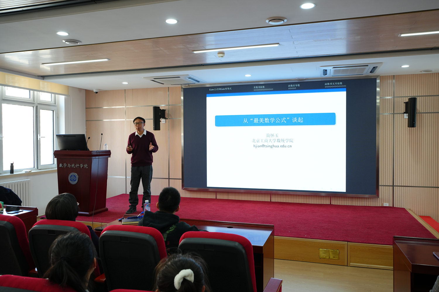 被称为“数学明珠”和“最美数学公式”。简教授首先介绍了18世纪数学界最杰出的人物之一——数学家欧拉的求学之路和学术成就,深入浅出地引领同学们走进了数学的神奇世界。通过回顾无穷级数、函数项级数、导函数、泰勒级数等概念和性质,简教授完整、清晰地讲授了欧拉于1748年在其代表作《无穷小分析》中给出的欧拉恒等式的一种巧妙的证明,从而得到了数e和圆周率π的准确值的表达式。此外,在报告中简教授还向同学们介绍了高斯(Gauss)、伯努利(Bernouli)家族、希尔伯特等重量级数学家的学术成就以及如Euler常数、超越数、黎曼猜测等数学界的一些重要研究。简教授的报告融合了丰富的中外数学历史与文化,揭示了欧拉恒等式及其证明所蕴含的核心数学思想与方法,引导同学们更加深入地领悟相关数学知识的内涵、联系和学术价值,使同学们深刻地领略到数学的优美与博大,激发了同学们学习数学的兴趣和探究数学的欲望。