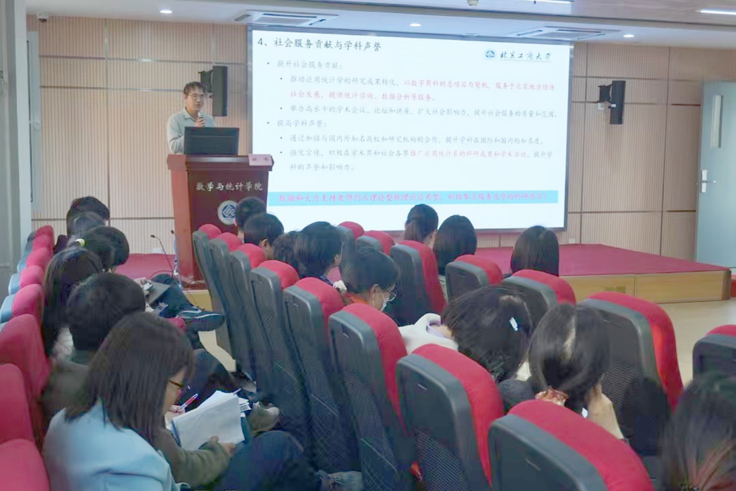 数学与统计学院副院长王康以“锚定一流学科,突出交叉特色,明晰战略定位”为主题,围绕学科布局、人才培养、研究梯队和科研发展四个方面进行专题汇报。应用统计系主任谢峰、数据科学系主任岳美玲、经济统计系主任赵江分别就各系的基本情况、研究方向和未来规划进行了汇报交流。