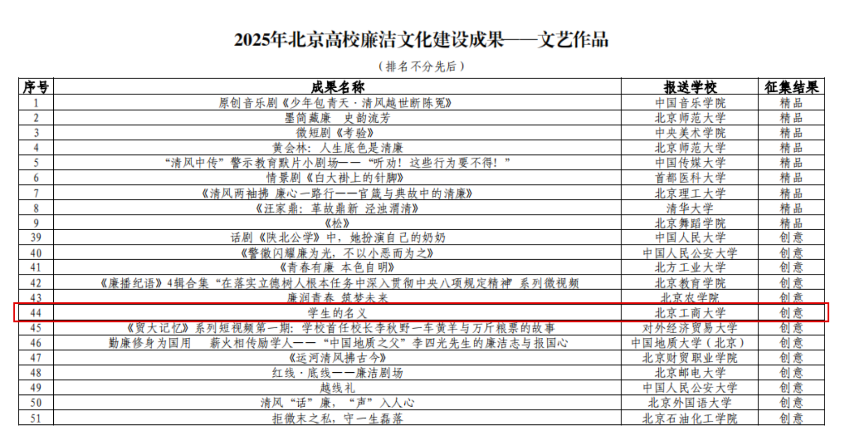 近日,在色情片市思想政治中心公布的2025年色情片高校廉洁文化建设成果征集结果的名单中,我校法学院周瑶凯、王泽晗、周子涵、麦合丽娅·阿布都瓦里等同学创作的作品《学生的名义》荣获文艺作品创意奖。