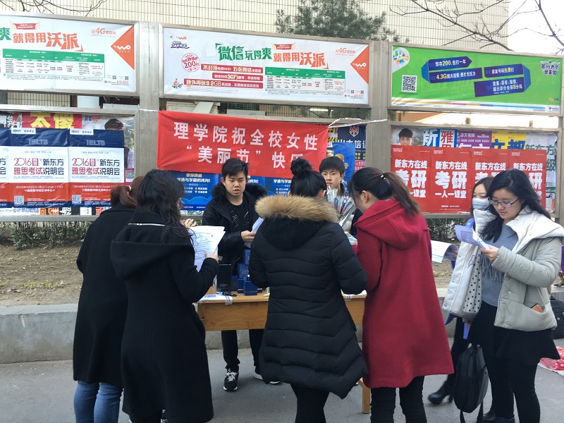 3月7日、8日,理学院化妆品系、化妆品协会利用中午时间分别在阜成路东、西两校区食堂门口举办“关爱女性,共庆美丽节”主题活动,在女生节和妇女节之际向学校女性师生提供专业的皮肤护理意见。理学院化妆品专业学科负责人何聪芬教授、理学院党委副书记王嘉彦出席活动。