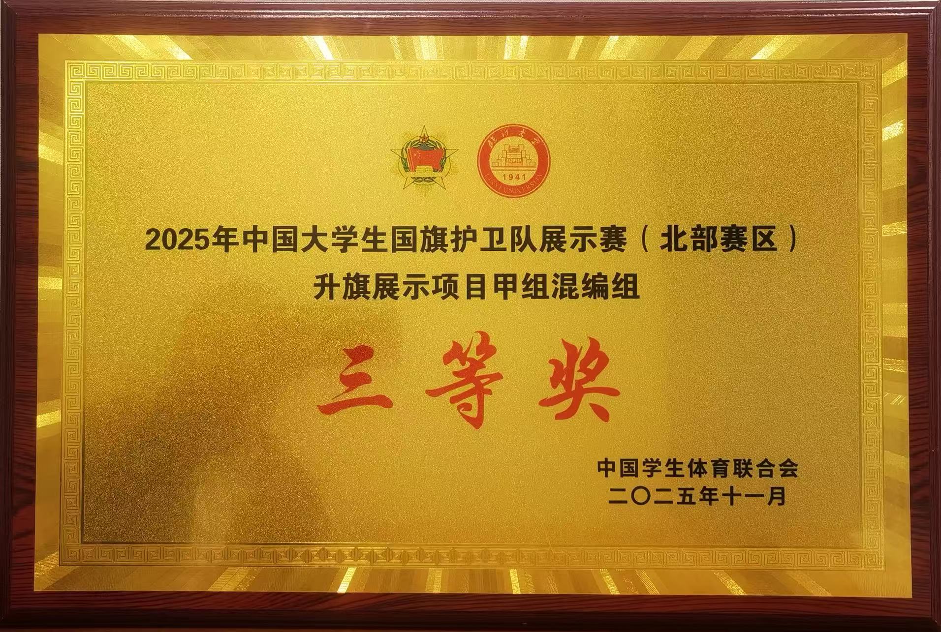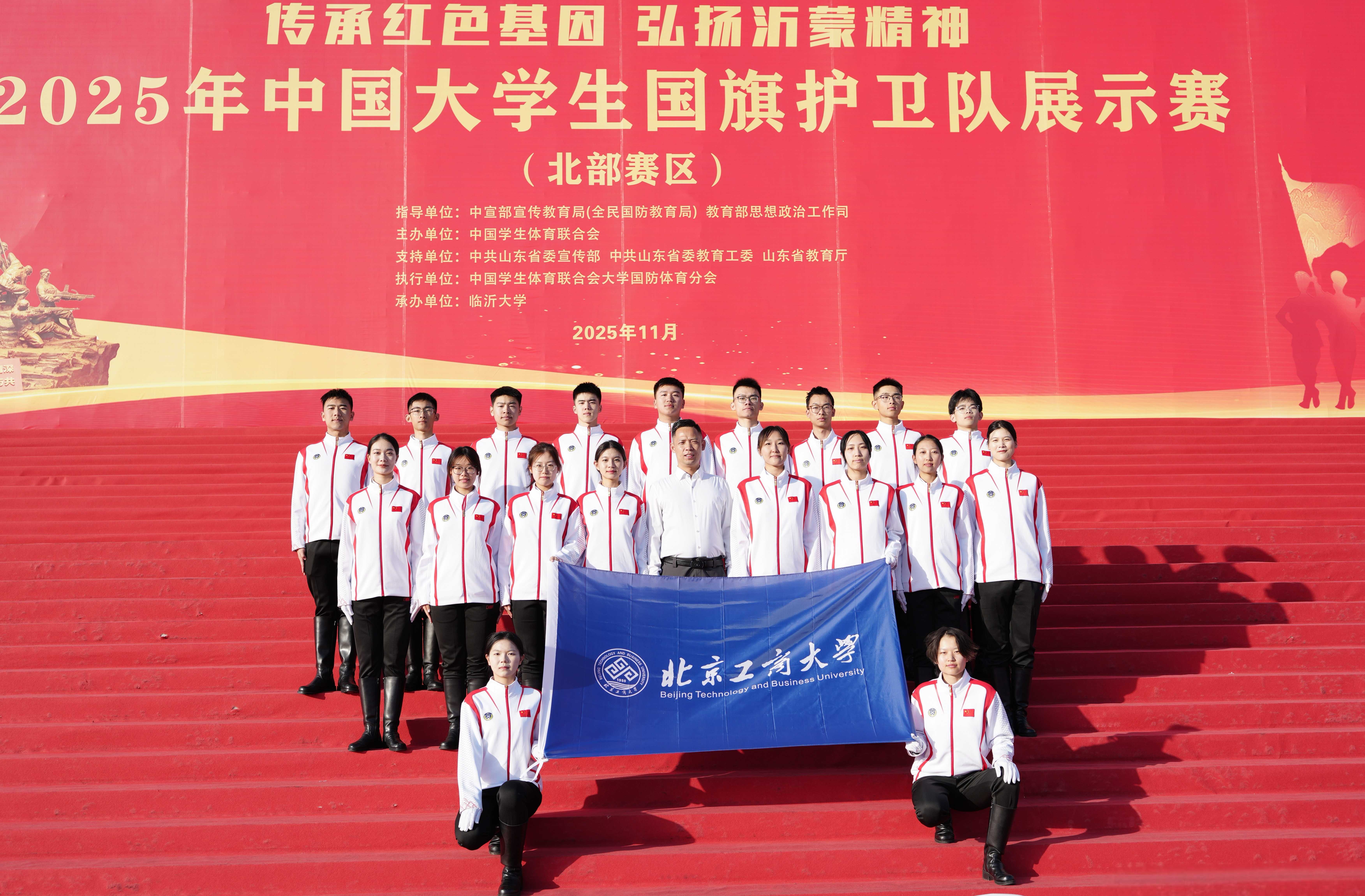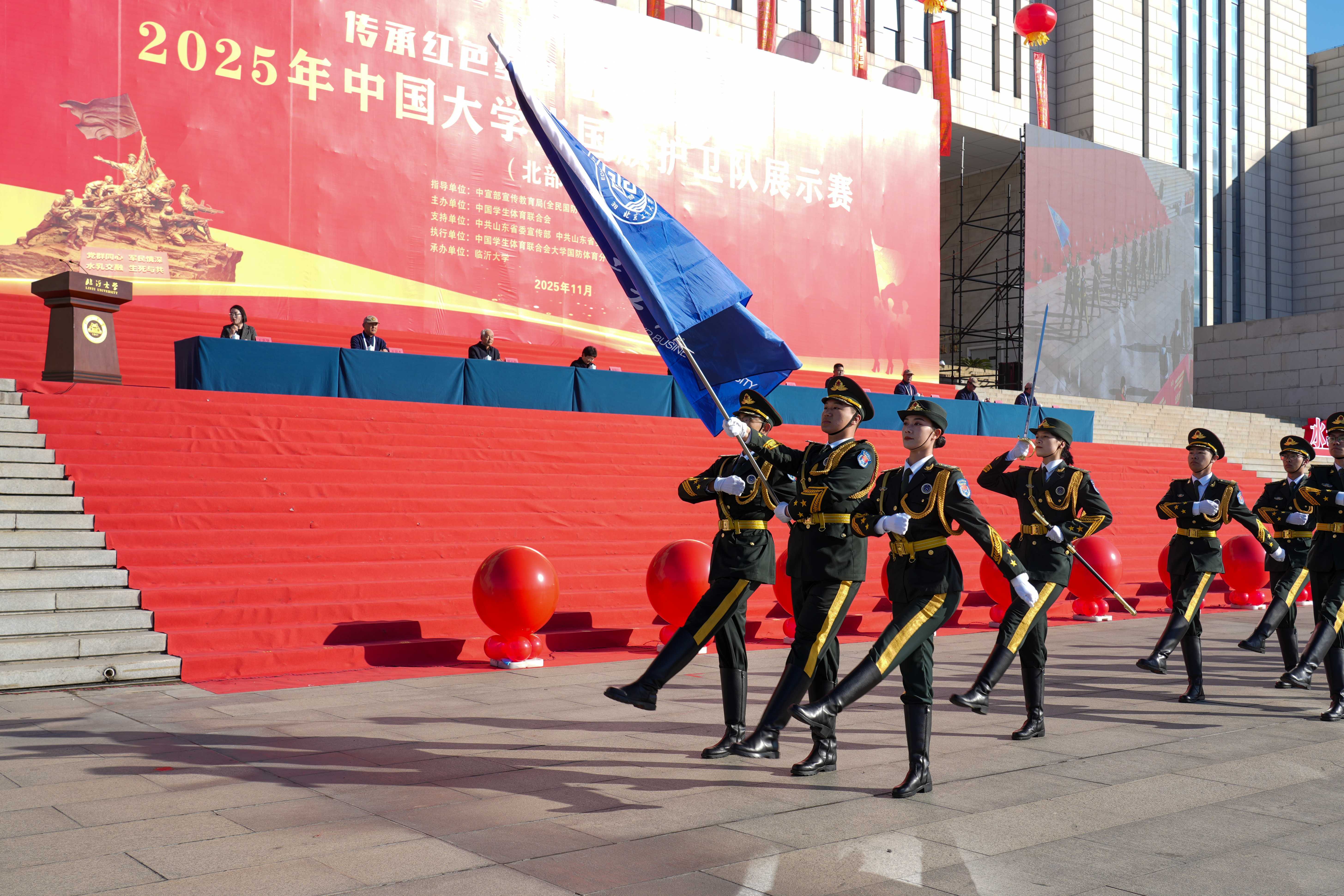 恰逢中国人民抗日战争暨世界反法西斯战争胜利80周年,2025年中国大学生国旗护卫队展示赛(北部赛区)于11月10日至12日在山东临沂圆满落幕。
