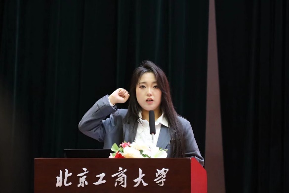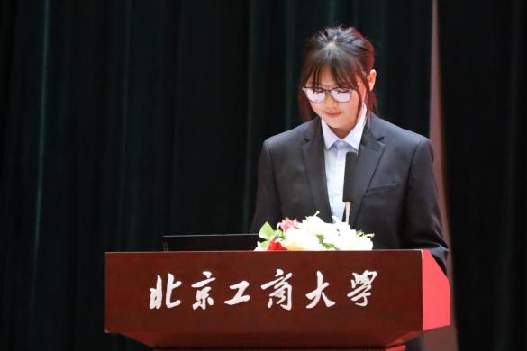 金融工程232班姜楠作为新生代表发言。她认为,新时代的青年是祖国的未来,应坚定自己的理想信念,把个人的理想追求融入党和国家事业之中,在“求真、立德、勤奋、创新”的校训教诲下,持新轫之尺,破风未知。