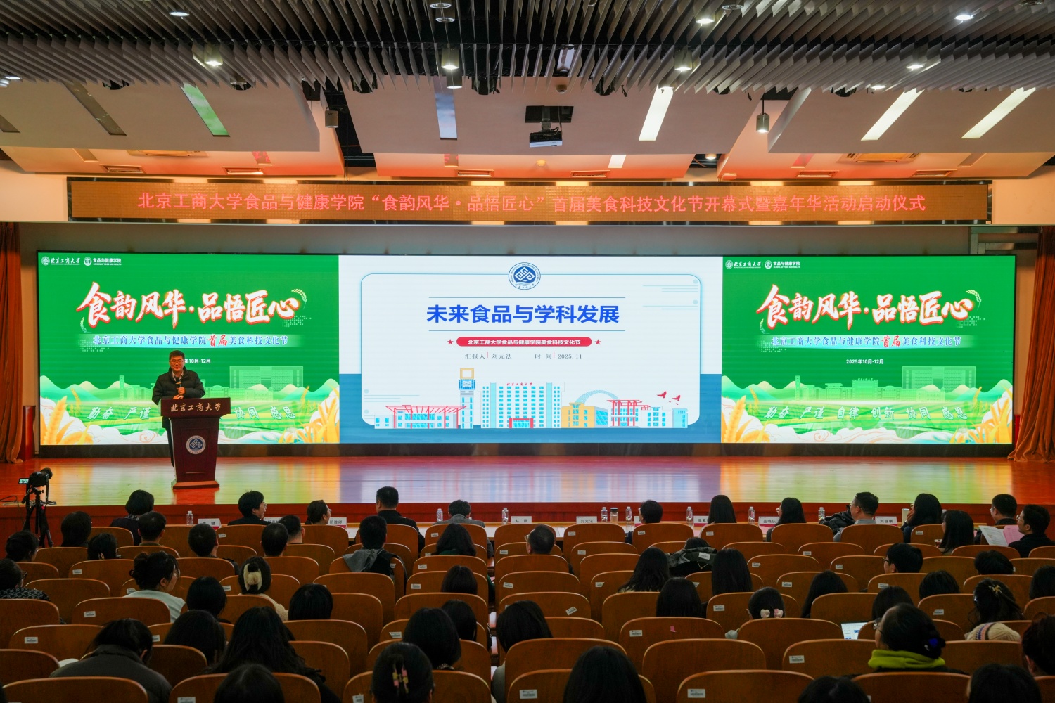 食品与健康学院院长王彦波致辞,向莅临活动现场的各界嘉宾表示热烈欢迎和衷心感谢。他谈到,学院始终坚持服务国家战略、服务新时代首都发展的使命,以“工商一体化”理念为引领,推动学科交叉融合,在“AI+食品健康”“智能检测技术”“功能性食品研发”等前沿方向持续突破。他鼓励同学们以美食科技文化节为“科创练兵场”,主动走进美食嘉年华和企业嘉年华,在互动中深化专业认知;主动参与学术交流,在研讨中拓宽思维视野;主动参加各类学科竞赛,在竞技中锤炼实践能力。