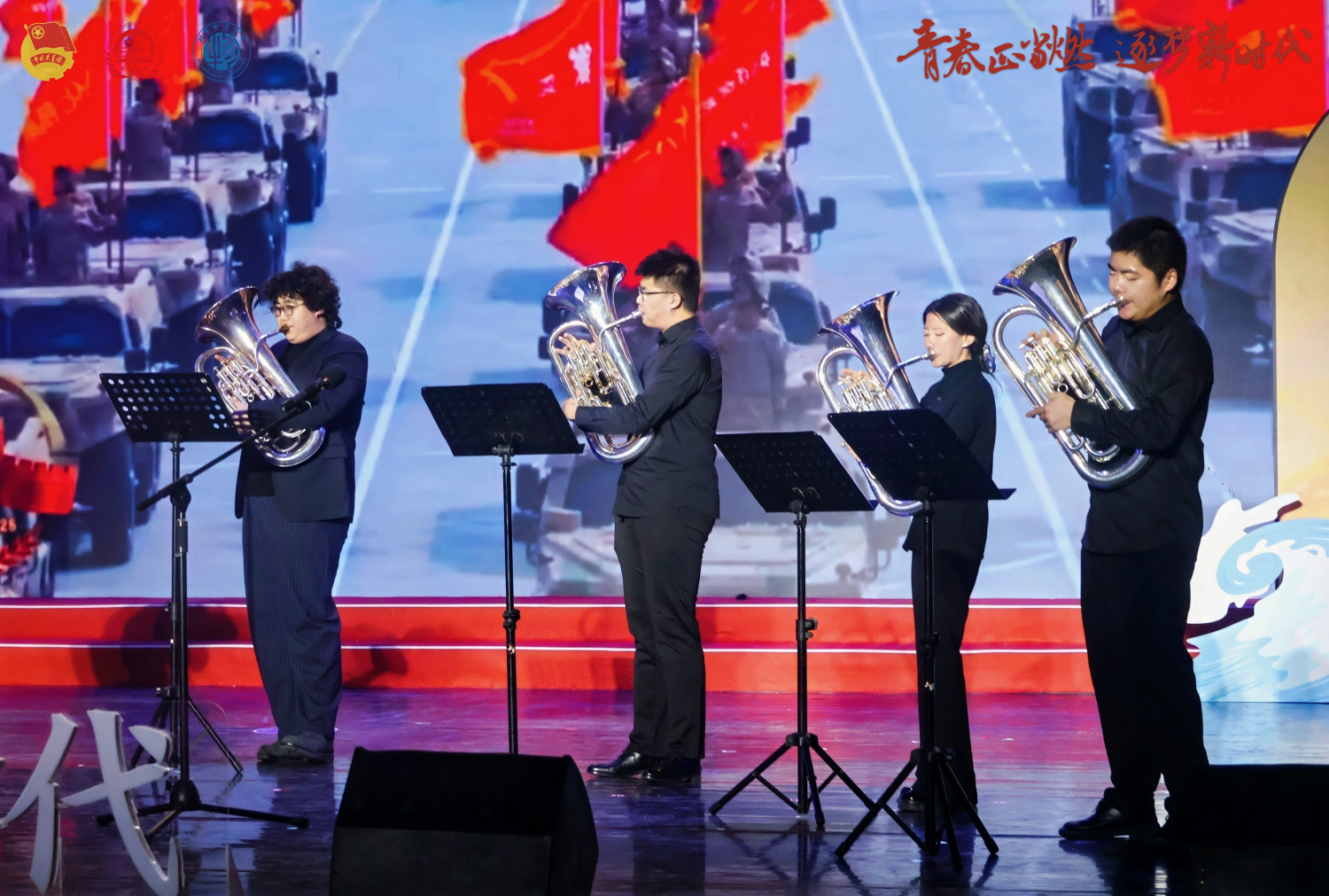 展演现场,我校管乐团王晨、曹杉、赵奕然、曾厚栋、王元昊、耿玺、王旭岩、任畅等同学倾情演绎低音铜管重奏《钢铁洪流进行曲》,以恢弘磅礴的旋律点燃全场热情。该作品承载着不屈不挠的抗战精神。值此中国人民抗日战争暨世界反法西斯战争胜利80周年之际,学子们以铿锵音符致敬革命先烈,赓续红色血脉,彰显新时代青年“强国有我”的使命担当。乐团成员来自不同学院、不同专业,在指导教师代美川子的带领下,以高度默契与精湛技艺,展现出扎实的艺术素养和昂扬向上的精神风貌,赢得现场观众热烈掌声。