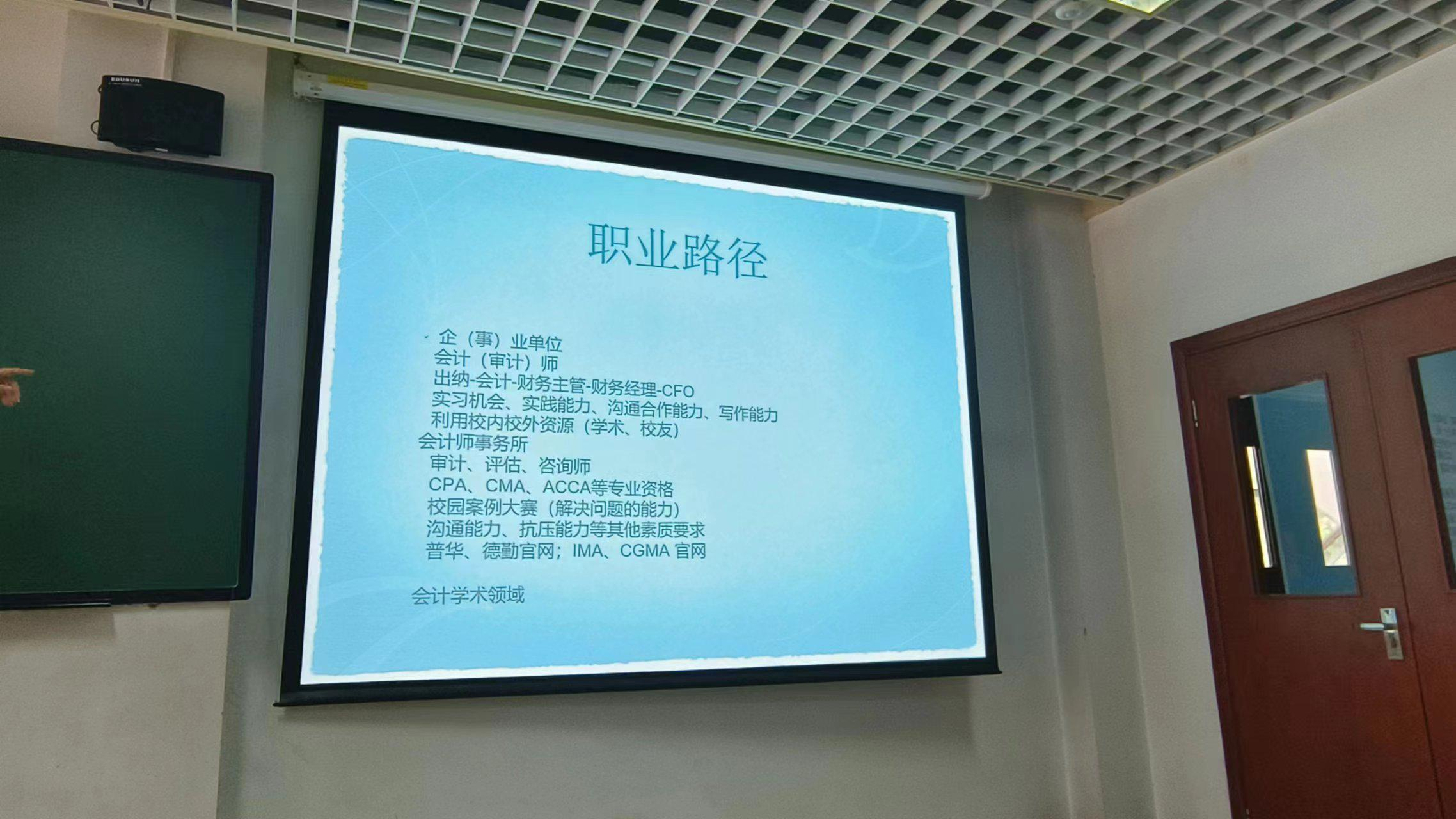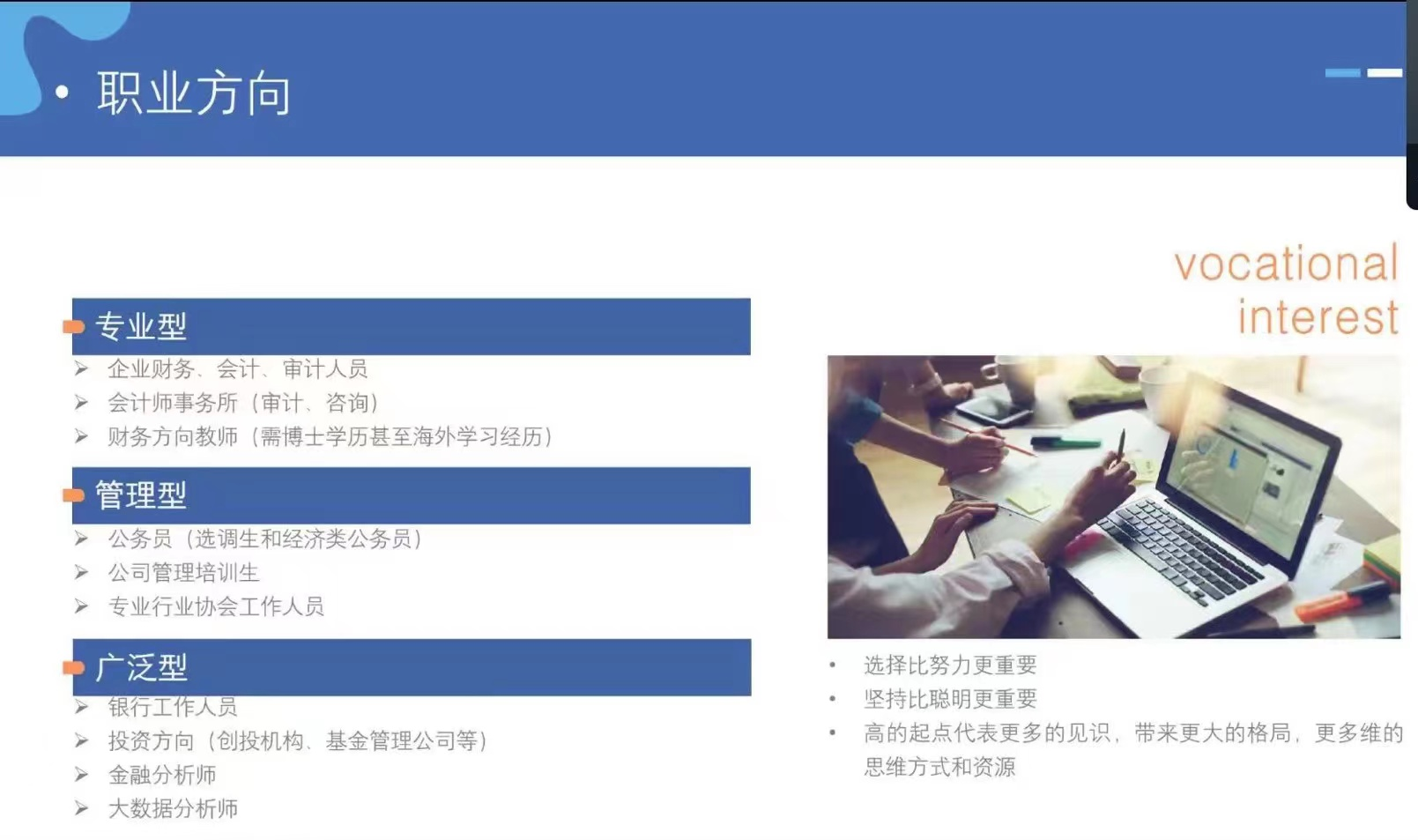 财务系高晨详细介绍了财会专业的职业发展方向,帮助学生们更全面地了解行业领域。她分别介绍了在企(事)业单位、会计师事务所和会计学术领域所能选择的方向。首先是在企(事)业单位方面,可以选择成为会计(审计)师,这一职业的常见发展路径是:出纳-会计-财务主管-财务经理-CFO。为了在职业发展中获得更好的机会,高晨建议同学们抓住实习机会,提高实践能力,加强沟通、合作和写作能力,同时,应珍惜校内外的资源。其次是会计师事务所,可通过获得CPA、CMA、ACCA等专业资格进入该领域,从事审计、评估、咨询等工作。此外,会计和财务专业毕业生还有其他就业选择,如创业、教育、咨询等领域,或进修更高级的学位,如硕士或博士学位,以提升个人职业发展。