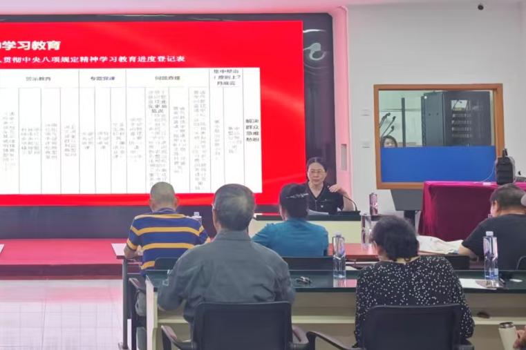王红英紧扣中央八项规定精神的内容和内涵,结合离退休党员的特殊身份,从“追溯历史、聚焦当下、凝聚共识”三个维度展开阐述。她指出,作风建设是铸就党的事业根基,中央八项规定的出台,彰显了党中央直面问题、刀刃向内的勇气和决心,要深刻理解中央八项规定精神的内容与内涵,领导干部要深入基层、深入群众、深入实际,求真务实,坚持有利于群众的原则切实开展工作,坚决抵制各种不正之风。