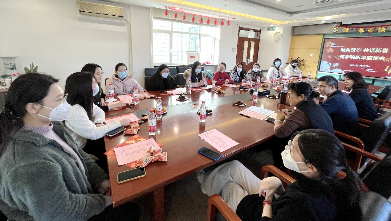 共话新春、共享祝福,献计发展、共促成长。1月16日下午,商学院组织寒假留校过节学生举行“瑞兔贺岁 共话新春”迎新春座谈会。学院党委书记张春萍、学校研究生院院长兼商学院院长毛新述、学院党委副书记张倩、辅导员马珂、张欣宇及12名留校过节本、硕、博学生参加座谈会。会议由学院党委副书记张倩主持。
