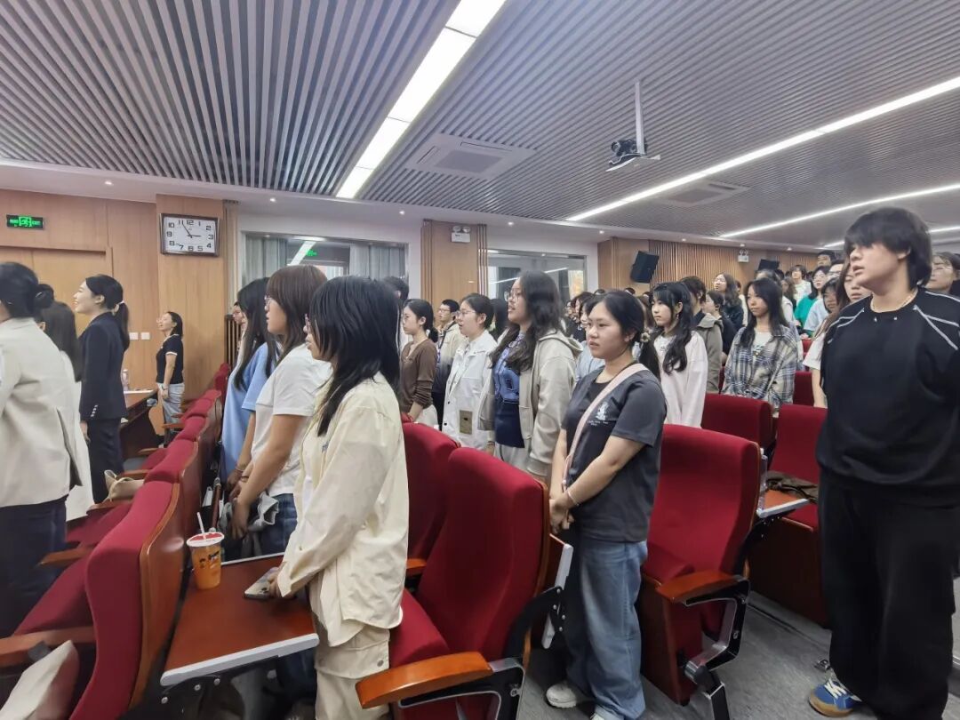 宣讲的尾声,一段深情的旋律悄然升起,将全场的气氛推向了最高潮。在丛榕老师的指挥下,全体师生代表肃然起立,齐声合唱《没有共产党就没有新中国》。这一刻,音符是精神的传递,是信念的回响,是熊熊燃烧的火炬,信仰的情感在歌声中得到了最直接、最淋漓尽致的抒发与升华。