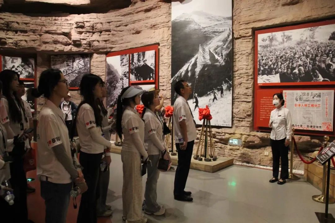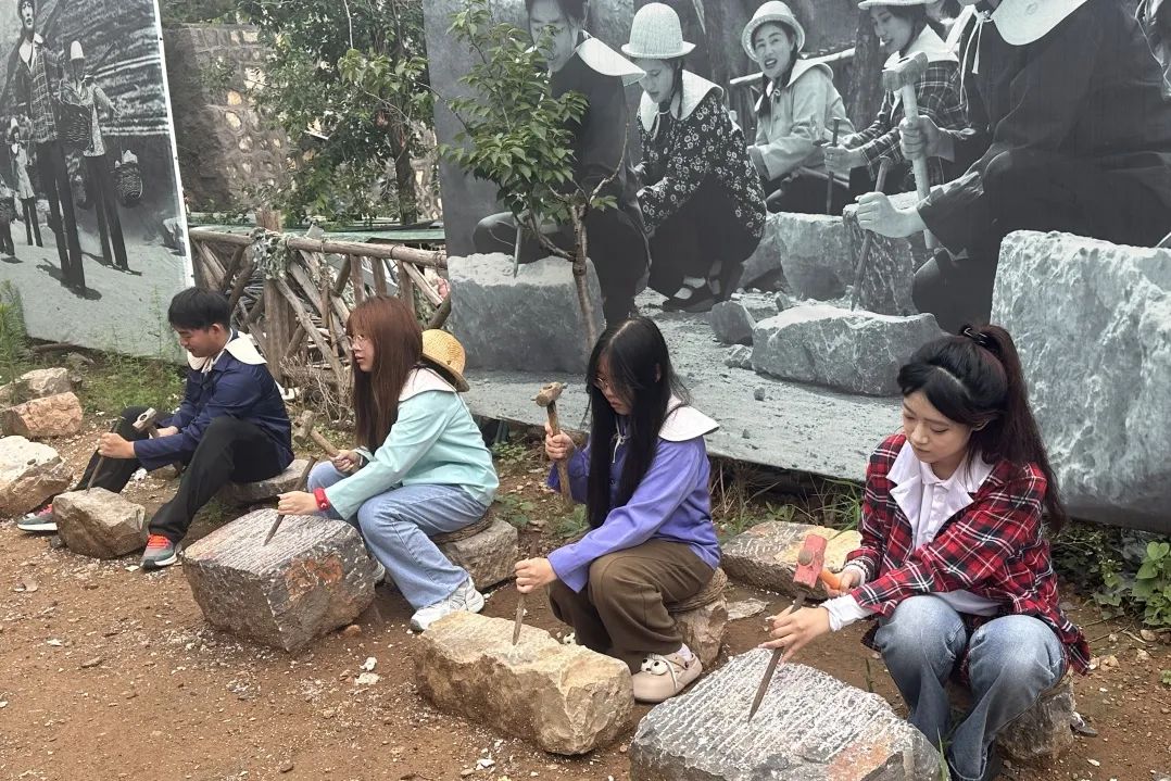 在河南林州红旗渠,数学与统计学院“复兴征程先锋团”和马克思主义学院的师生们,驻足于珍贵的历史照片和实物面前。锈迹斑斑的钢钎、布满补丁的工装,无声地诉说着“十年修一渠”的壮举:1250座山头被削平,1525公里渠线蜿蜒成“人工天河”。在青年洞前,成员们触摸着悬崖凿痕,面向党旗庄严宣誓,与当年青年突击队的呐喊隔空呼应。走进水电站,他们抡锤扛石、采集数据,沉浸式体验建渠的艰辛,让专业知识扎根实地。沿着前辈们凿石修渠的路线一路前行,亲身感受战天斗地的豪情壮志,深刻领悟“自力更生、艰苦创业、团结协作、无私奉献”的红旗渠精神。