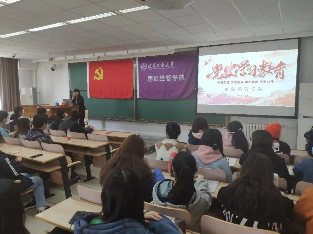 3月,国际经管学院召开本科生党史学习教育动员大会,要求全体学生党员深入学习领会习近平总书记在党史学习教育动员大会上的重要讲话精神,认真完成学院党史学习教育各项安排,确保党史学习教育取得实效,从党史学习教育中汲取信仰、智慧和力量,理论结合实践,积极参与到党史的学习实践活动,发挥党员的榜样示范作用,以昂扬的姿态迎接中国共产党成立100周年。学生党员通过多种形式开展体验式、沉浸式、研讨式学习,集体学习“首都百万师生同上一堂党史课”网络公开课,感悟共产党百年不渝的初心使命,坚定永远跟党走的决心,建功立业新时代。