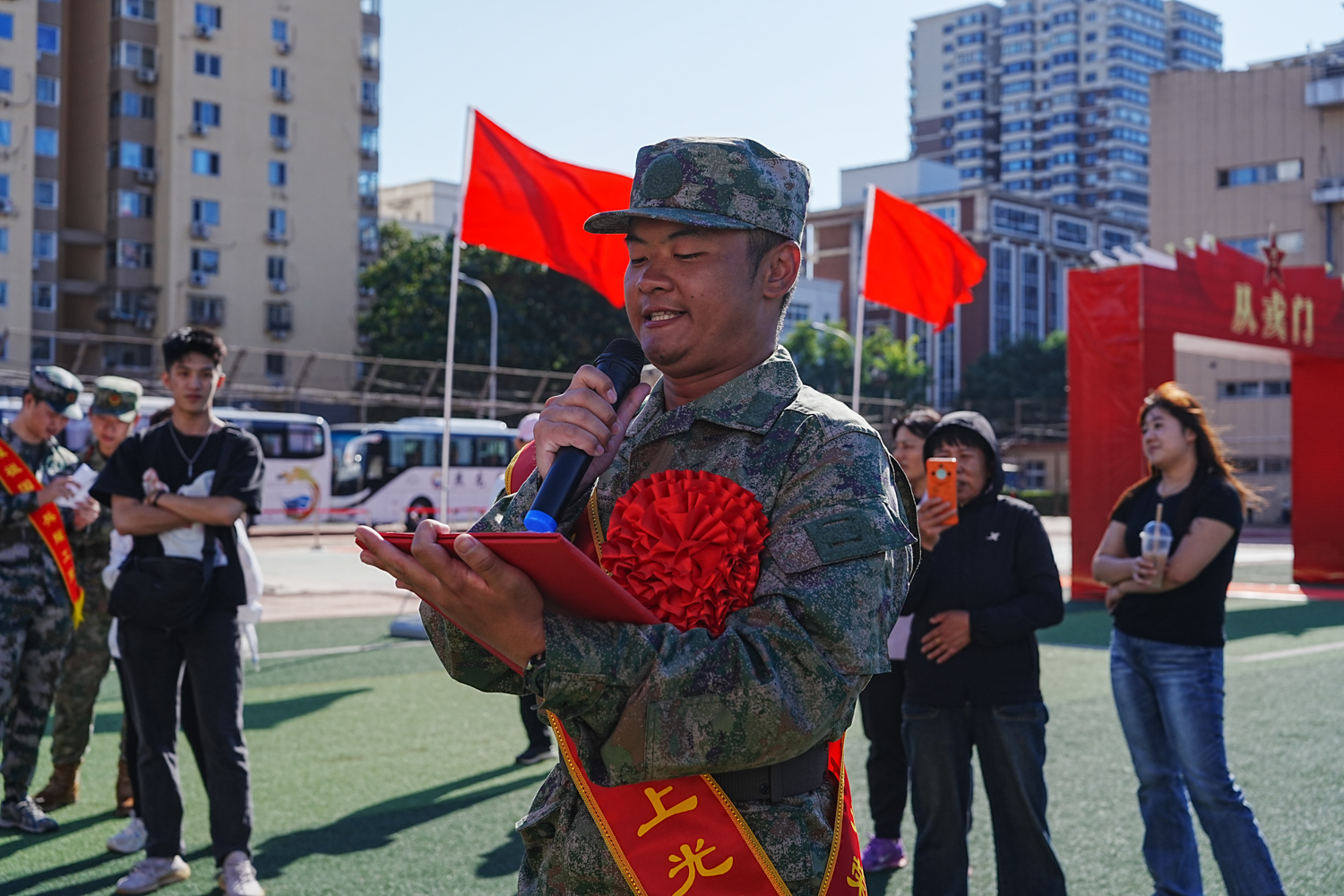 来自商学院的毕业生崔富兴代表入伍新兵发言。他分享了自己报名参军的初心,讲述了自己渴望建功军营,以青春之我守护盛世之中华的责任担当。他代表全体入伍新兵郑重承诺,将不负母校和父母的期望,在军营中严守纪律、刻苦训练、锤炼本领,以实际行动捍卫“听党指挥、能打胜仗、作风优良”强军誓言。