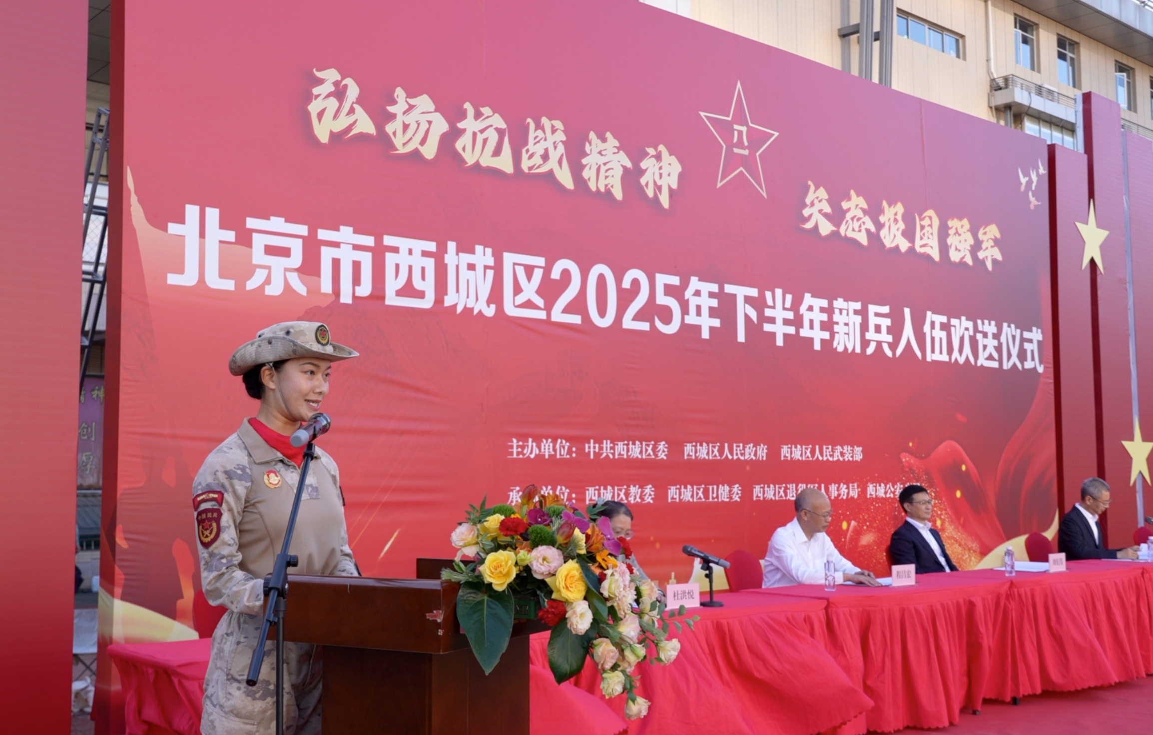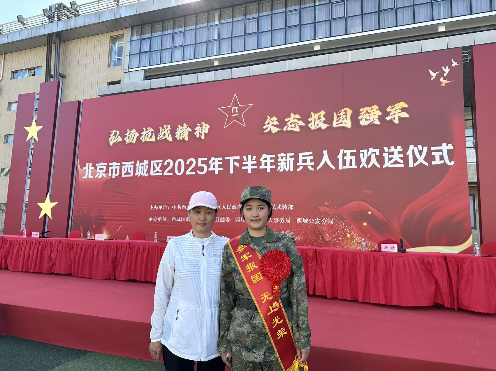 活动结束后,全体师生及家长参加了由西城区人民武装部组织的西城区2025年下半年新兵入伍欢送仪式。我校学子陆俊卉作为退伍大学生代表在会上进行发言。她回顾了自己参与九三阅兵的经历,并向西城区全体秋季入伍新兵送上了寄语。
