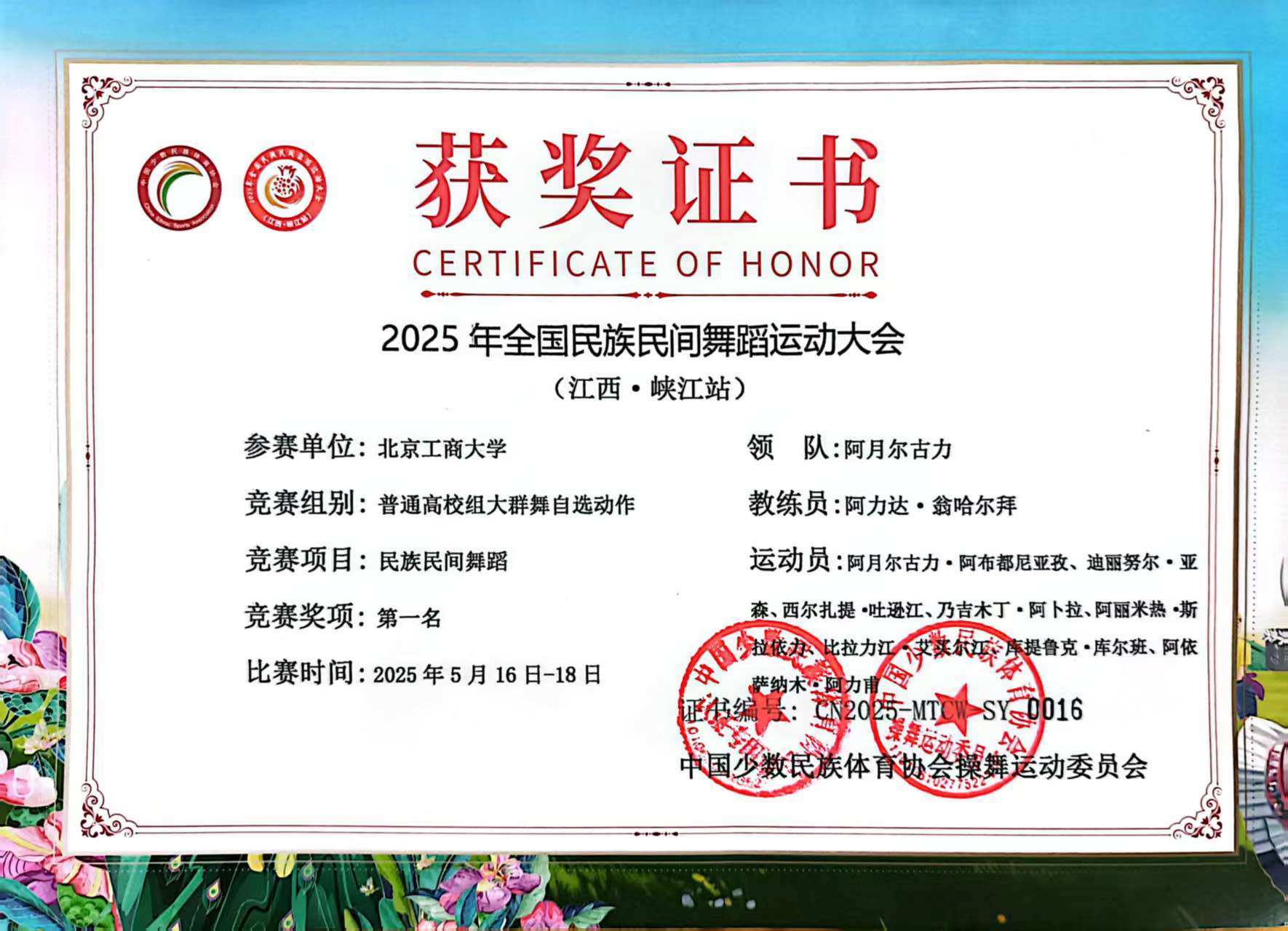 2025年5月17日,由中国少数民族体育协会指导,峡江县人民政府联合中国少数民族体育协会操舞运动委员会共同主办的2025年全国民族民间舞蹈运动大会在江西峡江举办。我校8名学生代表表演的舞蹈作品“石榴花开”从众多优秀参赛作品中脱颖而出,荣获民族民间舞蹈组第一名的好成绩。