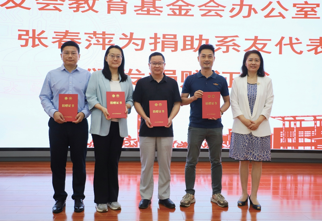 学校校友会教育基金会办公室主任张春萍为捐赠系友代表颁发捐赠证书和纪念品,以感谢他们对母校教育的反哺。