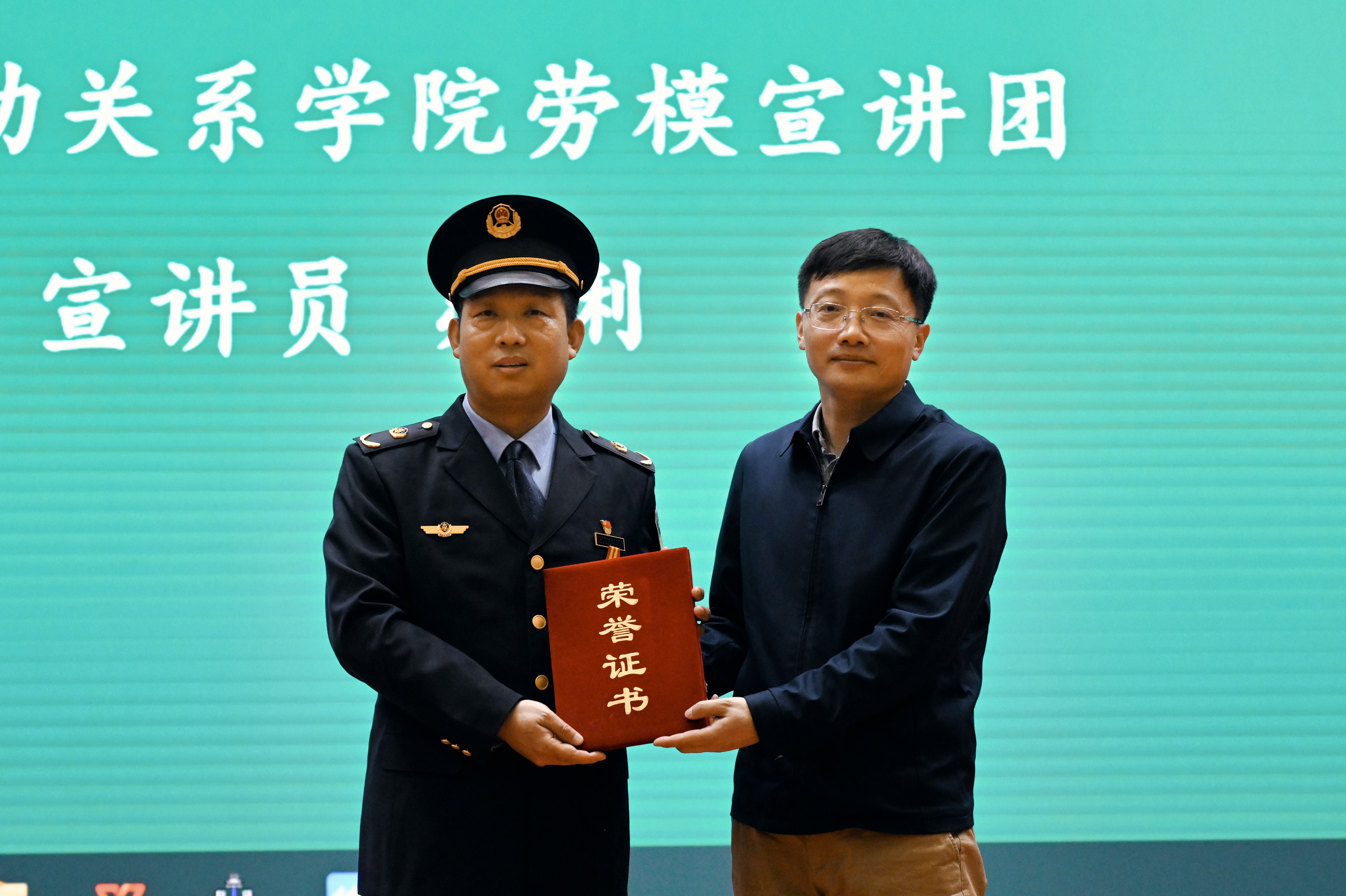 在讲座开始前,党委学生工作部部长、学生处处长兼武装部部长郑光,学校工会常务副主席杜亚辉,党委学生工作部副部长、学生处副处长兼武装部副部长党浩分别为授课劳模颁发了学校劳动教育教研室“校外讲师”聘书。