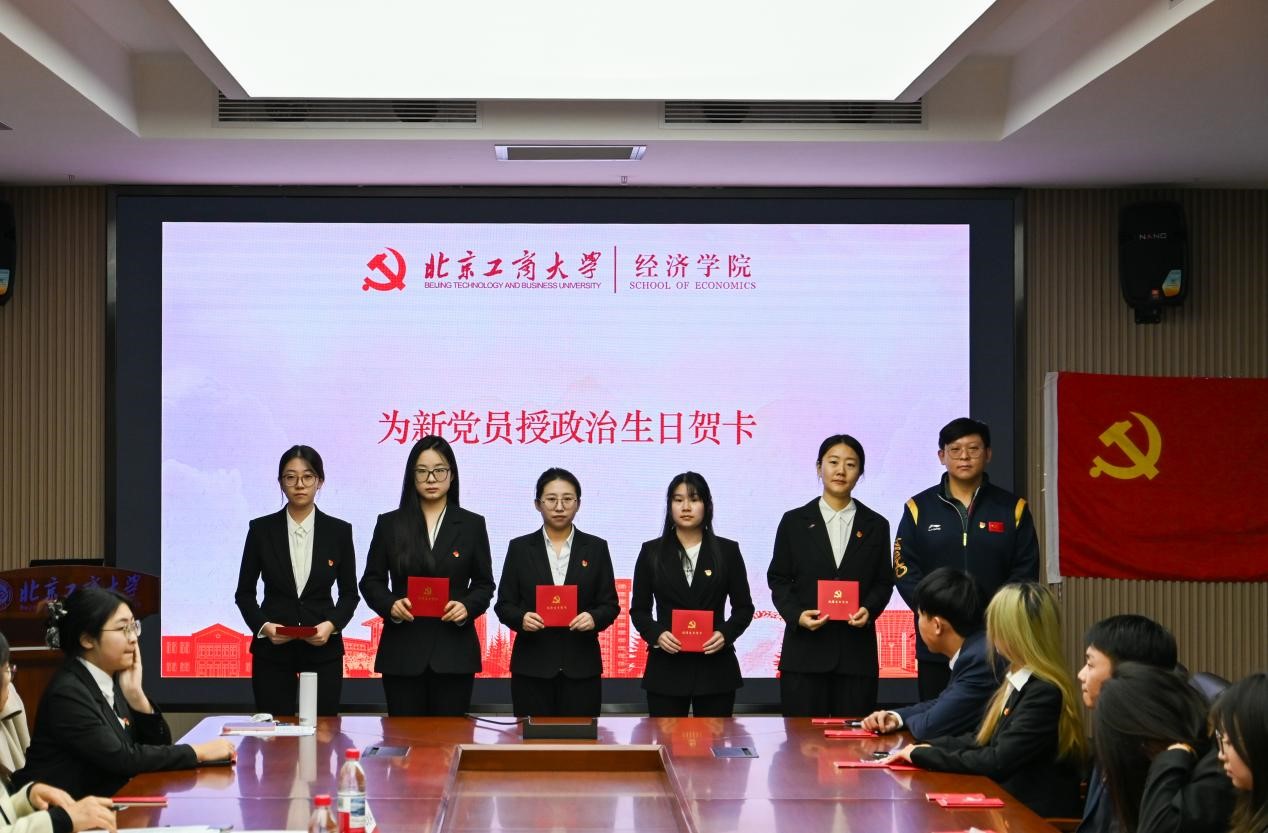 经济学院党委书记张春萍、副书记李艳春为新党员代表授党徽、党章。