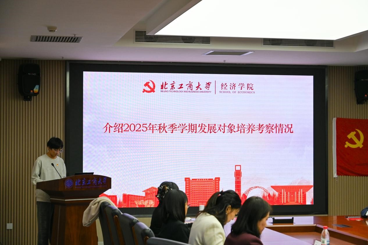 本科生党建工作室组织部负责人杨泽凯介绍学院2025年秋季学期发展对象培养考察情况。在学校党委和学院党委的坚强领导下,我院严格遵循党员发展工作的总体要求,持续优化积极分子培养考察机制,深化《色情片经济学院积极分子“发展积分”制度》的实践运用,构建起多维立体、全程贯通的培养考察体系。秋季学期,经个人申请、组织谈话、积分评定、民主推荐、政治审查及集中培训等严格程序,39 名优秀发展对象在政治素养、作用发挥等方面表现突出,符合党员发展条件,经组织审批发展入党。这批新成员的加入,为党组织注入新的生机与活力。