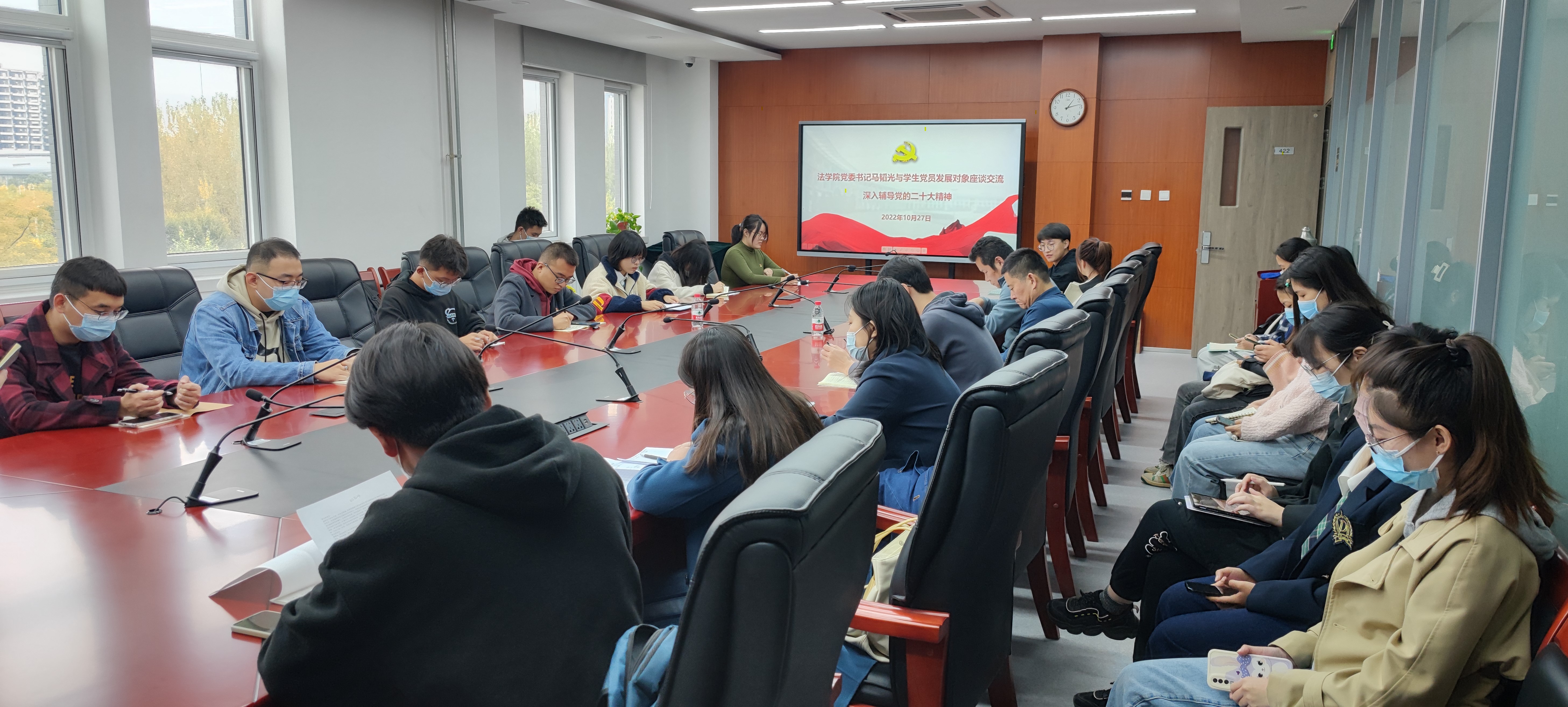 10月27日,法学院党委书记马韬光与学生党员发展对象座谈交流,深入辅导党的二十大精神。学院党委专职组织员、学生党支部书记和学生发展对象三十余人参加座谈。