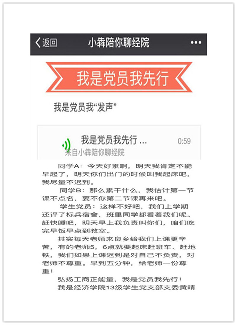 学生党员勇于“发声”,通过学院微信平台“小犇陪你聊经院”,每天推出一期学生党员“弘扬工商正能量”公益语音活动,由学生党员录制1分钟微音频,围绕尊师重道、感恩父母、卫生宿舍、文明礼仪、节约用水、安全用电、走下网络、走出宿舍、走向操场等为主题展开“发声”号召,通过线上线下互动结合,向在校学生弘扬工商正能量,传播核心价值观。