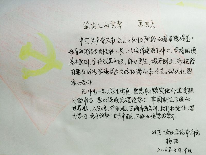 3月初,学院学生党支部开展了“笔尖流走,手书党章党规”活动,旨在通过“抄、展、评”三个环节,引导党员逐条逐句抄写党章党规和系列讲话,牢记入党誓言,牢记党的宗旨。活动开展以来,学生党员积极响应,其中既有极富创意的入党积极分子的感想,也有书法精湛的预备党员和正式党员的作品。他们说,好久没有认真写过文字了,通过摘抄一段有感触的党章内容,感觉文字静静地流进心中,也进一步牢记了党的全心全意为人民服务的宗旨。