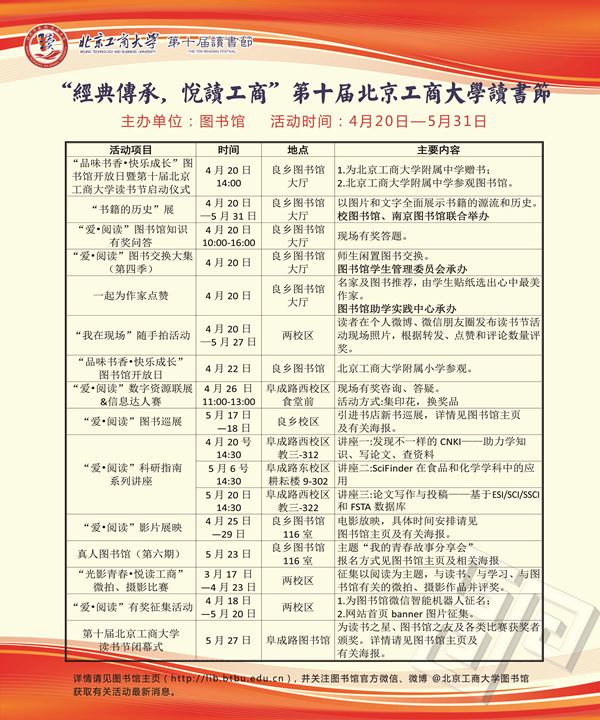 为提升校园阅读氛围,构建书香浓郁的校园环境,增进读者与图书馆的沟通和交流,在第21个“世界读书日”到来之际,学校第十届读书节将于4月20日在良乡校区图书馆正式启动。