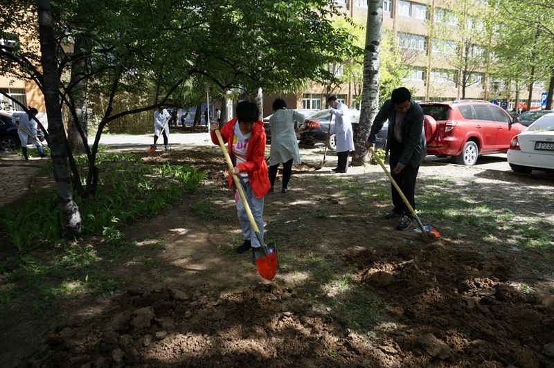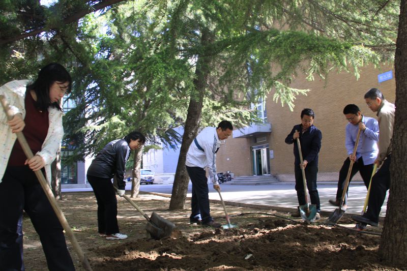 春回大地,草木绽绿。4月14日上午,天气晴朗,阳光明媚。为给全校师生创造一个更加美好、更加舒适的学习和生活环境,进一步增强后勤部门党员的凝聚力,后勤部门党总支在阜成路校区综合楼东侧,开展了以“义务劳动、美化校园”为主题的党日活动。副校长郑文红与党员同志们一同参加劳动。