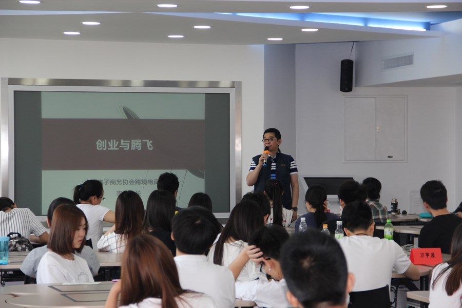 赛前,还邀请了中国电子商务协会跨境电商分会李生会长以《创业与腾飞》为题进行讲座,文科实践中心主任郭馨梅主持。李生会长讲述了自己16年来从最初舍弃世界五百强企业高薪开始IT创业,到零售管理咨询培训创业,再到跨境电商创业的三次经历,鼓励学生应把握大势,抓住机遇,勤奋学习,积极进取,广交朋友,开拓视野,讲求诚信。他还告诫同学,创业不能利益至上,更应该保持一种情怀。随后,李生会长详细解答了同学在创业过程中的困惑,并给出了成功创业的有益建议。李生会长以其勤奋好学、业务精通、孜孜追求、取舍自如和极佳的口才赢得了一致好评。