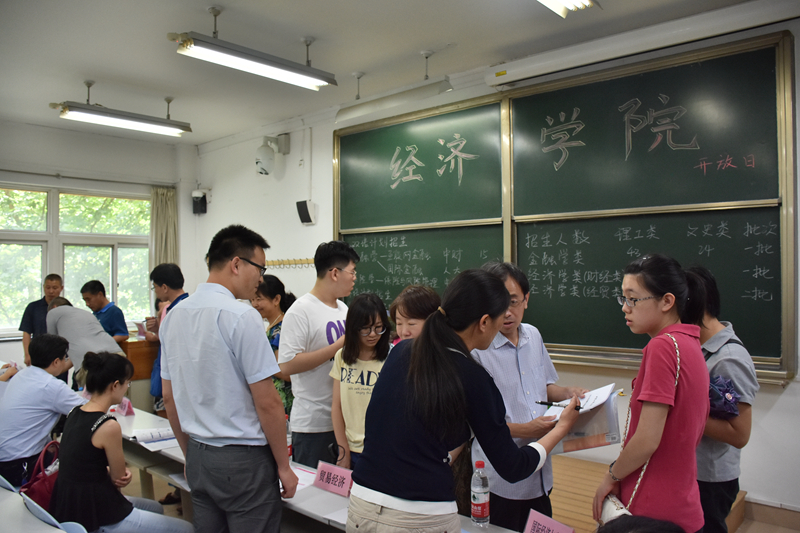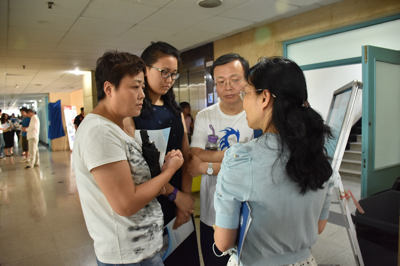 35度的高温并没有阻挡住考生和家长来校咨询的热情。在众多的咨询者中,有考生和家长一起来的,有家长单独来咨询,也有考生独自来校了解自己感兴趣的学院和专业。一对双胞胎姐妹花在妈妈的陪伴下从经济学院走出来,妈妈说:“姐妹俩对咱们学校的经济类专业比较感兴趣,经过老师的详细介绍,她们对经济学院更加向往了,准备报考。”在商学院门口,一个身背双肩包,目光坚定的小伙子引起了记者的注意,他告诉记者,今天是自己一个人来的,听亲戚说北工商的商科不错,自己又是文科生,将来想做营销方面的工作,向专业老师进行了详细询问。