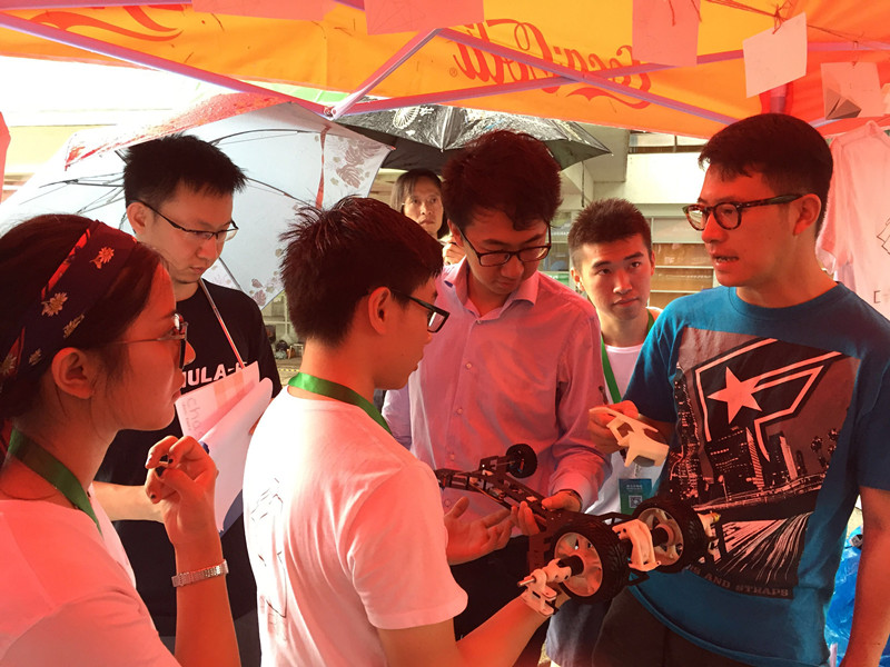 我校两个代表队均由艺传学院产品设计专业2014级同学组成,Chasers车队队员是彭博宸、宋甲凯、曹叶田、王楚云;Air Rocket车队队员是满开策、张鸿志、况纪兴、张茗轩,梁珣教授任指导教师。今年,竞速赛依旧延续历年的赛段模式,分为拉力竞速赛、障碍竞速赛和坡道竞速赛三个赛段。而今年的赛道相较于往年有所不同,坡道竞速赛的弯道由90度弯改为57度弯,赛道的整体路面情况也更富挑战性。且比赛场地设置在室外,又正逢汕头下雨,对各参赛车队的车辆性能及选手的操控技术与心理素质都是一场前所未有的考验。Chasers队长彭博宸在赛后感言:“踏实地向前多走一步,目标就离你更进一步。”