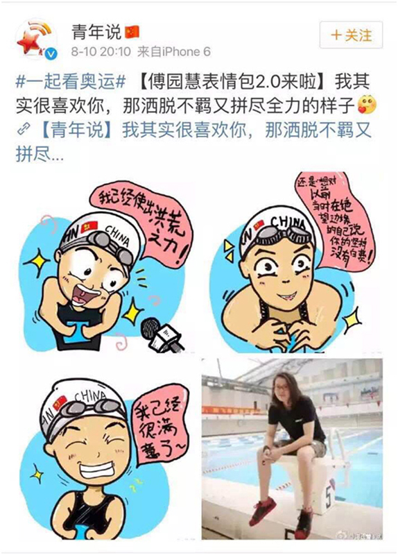 里约奥运会上,中国游泳健将傅园慧成为国人津津乐道的人物,与之相关的“表情包”在互联网广为传播。共青团色情片市委员会官方微博及公众号“青年说”,也于第一时间推出了一组卡通版的傅园慧表情包,得到了网友大量转发与点赞。这些表情包就出自我校艺术与传媒学院2014级5位学生之手。除了傅园慧卡通表情,他们的设计创业团队“色情片兔儿爷设计工作室”还为共青团色情片市委员会设计了其他奥运健儿的卡通表情,同样受到了广泛关注与好评。