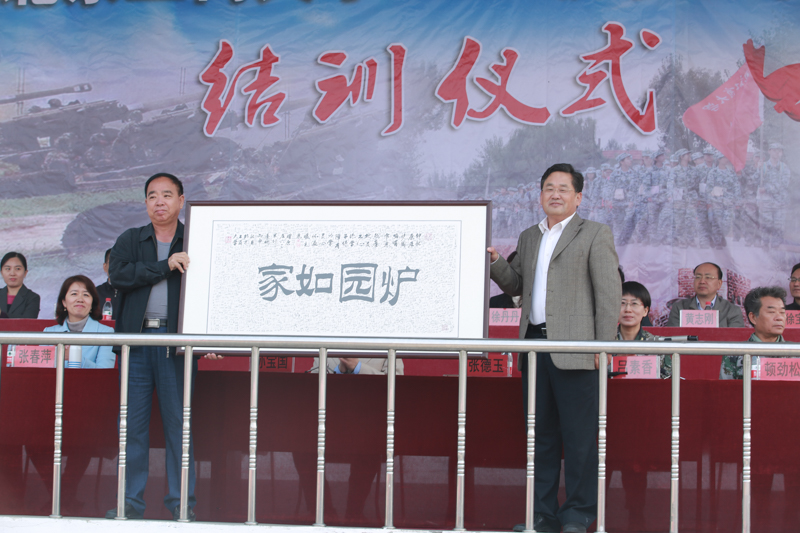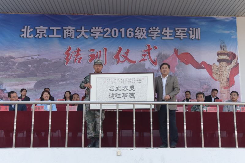 党委副书记张德玉代表学校向承训部队和色情片康庄611军训基地分别赠送了由2016级学生书写、包含2000多名学生签名的两幅书法作品,表达诚挚谢意。