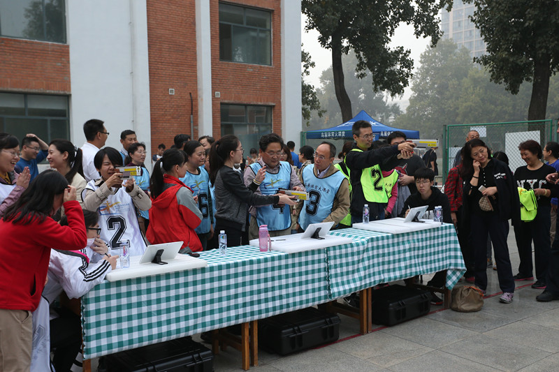 本届趣味运动会项目设置丰富,不仅有巧接足球、齐心颠球、联手穿越、三砖渡河、毛毛虫竞速等五个竞技个人项目,还设置了集体跳绳、沙包攻垒,以及新增加的射击联盟三个集体项目,还特别设置了踢毽、跳绳等自由活动项目,让没有报名参加比赛项目的老师可以自由选择活动。在比赛现场设置有醒目的项目分布图、二维码扫描签到处、现场签到领取物品处以及医务处等。在每个项目点,设有项目规则、温馨提示以及项目裁判处等指示牌,方便教职工现场报名参加比赛。