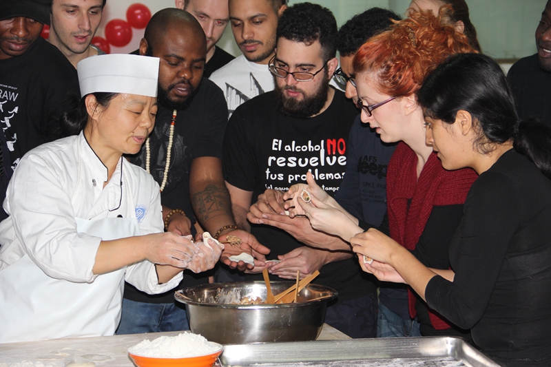 来自我校食堂的三位面点师傅分三个大桌手把手地开始教留学生如何包饺子。对于从未包过饺子的外国留学生来说,包饺子是一项比较困难的技术活。在食堂师傅和志愿者的耐心帮助下,每一个外国留学生都学会了擀皮,包出了自己满意的饺子。大家兴致很高,经过将近1个半小时的努力,大家一同品尝了亲手包的热气腾腾的饺子。来自意大利、法国、韩国、巴基斯坦、喀麦隆等30个国家的留学生们品尝饺子后,一边伸出大拇指,一边用普通话说:“好吃,好吃!”